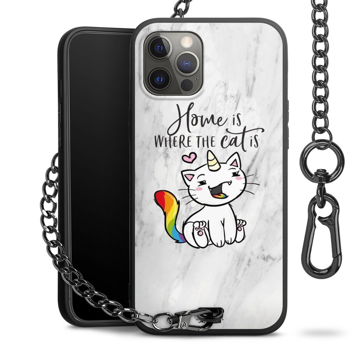 Die mattschwarze Silikon-Handyhülle besteht aus robustem TPU (thermoplastisches Polyurethan). Sie ist flexibel und schützt Dein Smartphone vor Stößen und Kratzern. Die Kette sowie der Karabinerhaken sind aus Metall in Gunmetal-Optik gefertigt. Für dieses Produkt kommen ausschließlich TÜV-geprüfte Materialien zum Einsatz.