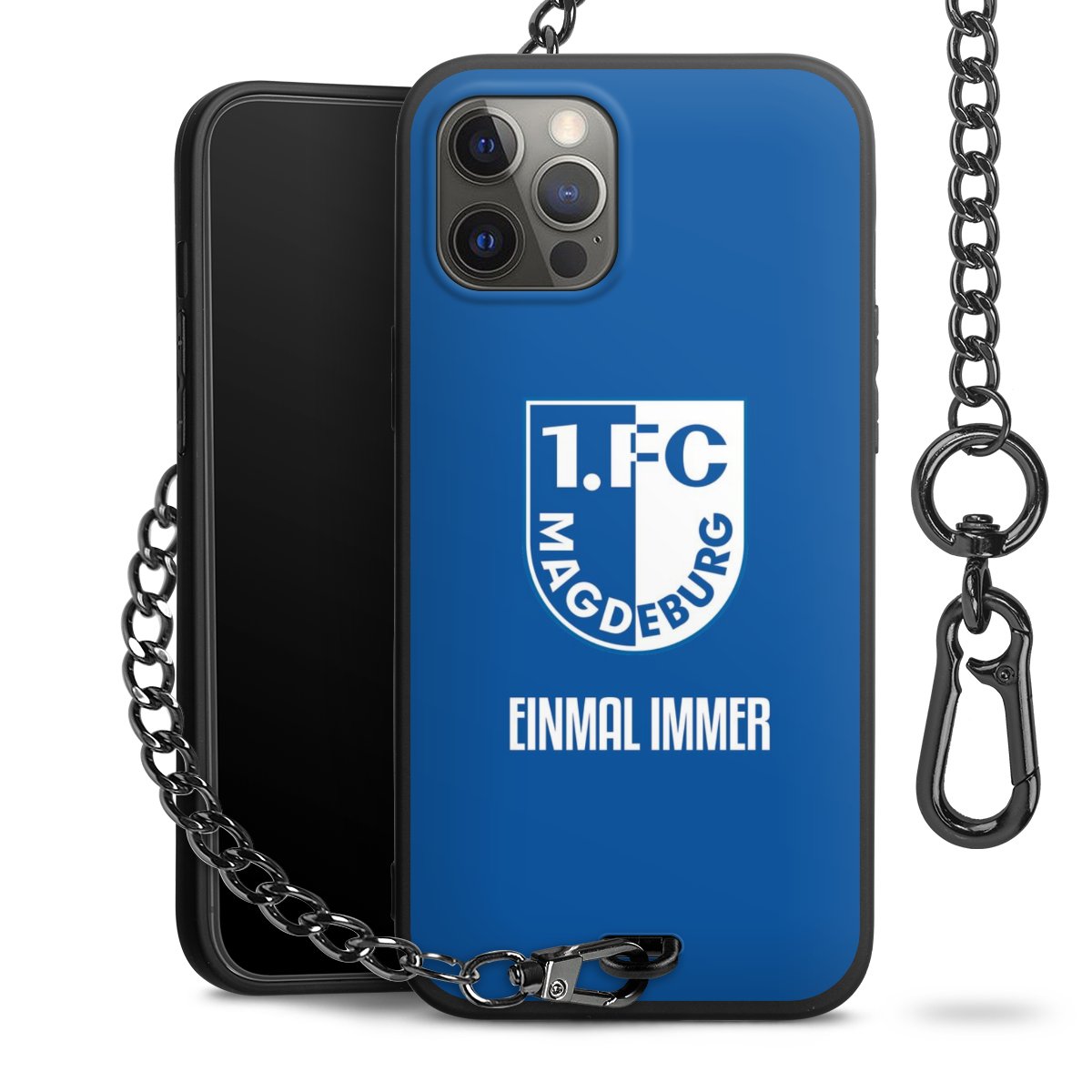 Die Handyhülle verfügt über eine mittig am unteren Rand platzierte Öse, an der die Metallkette stabil befestigt ist. Bestelle die Hülle einfach für Dein Smartphone-Modell, dann passt sie wie angegossen und Du brauchst sie bloß einmal anzudrücken. Handy in die Tasche, Karabiner an den Hosenbund – schon kann die Party starten.