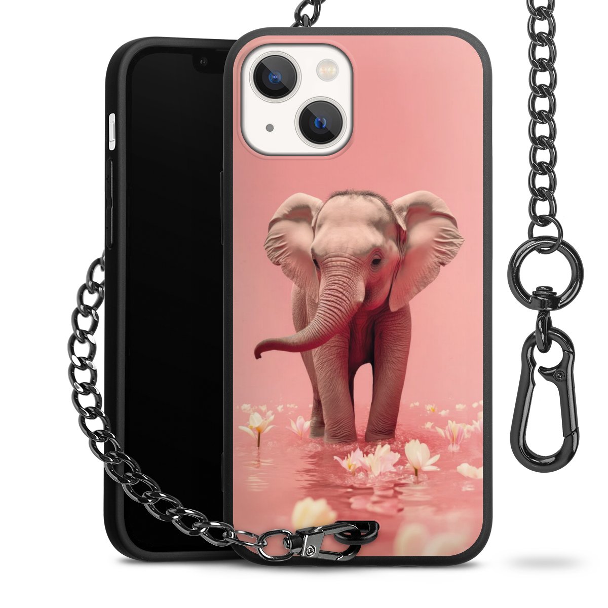 Die Handyhülle verfügt über eine mittig am unteren Rand platzierte Öse, an der die Metallkette stabil befestigt ist. Bestelle die Hülle einfach für Dein Smartphone-Modell, dann passt sie wie angegossen und Du brauchst sie bloß einmal anzudrücken. Handy in die Tasche, Karabiner an den Hosenbund – schon kann die Party starten.