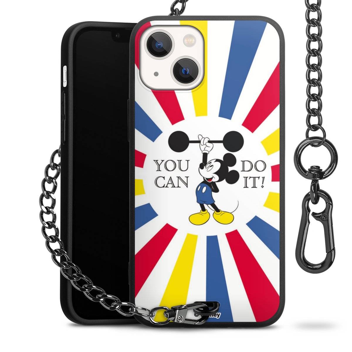 Die Handyhülle verfügt über eine mittig am unteren Rand platzierte Öse, an der die Metallkette stabil befestigt ist. Bestelle die Hülle einfach für Dein Smartphone-Modell, dann passt sie wie angegossen und Du brauchst sie bloß einmal anzudrücken. Handy in die Tasche, Karabiner an den Hosenbund – schon kann die Party starten.