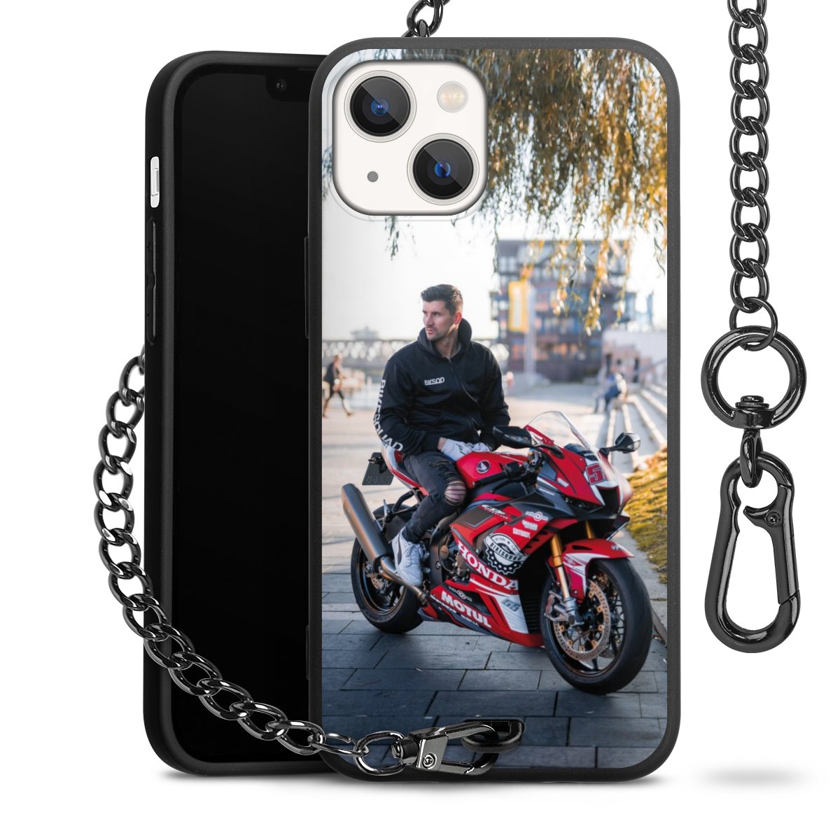 Die Handyhülle verfügt über eine mittig am unteren Rand platzierte Öse, an der die Metallkette stabil befestigt ist. Bestelle die Hülle einfach für Dein Smartphone-Modell, dann passt sie wie angegossen und Du brauchst sie bloß einmal anzudrücken. Handy in die Tasche, Karabiner an den Hosenbund – schon kann die Party starten.