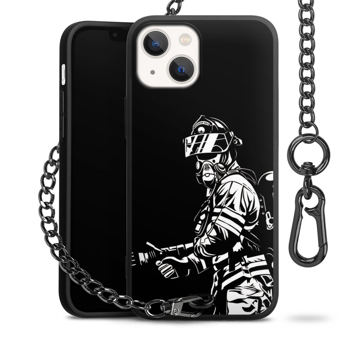 Die mattschwarze Silikon-Handyhülle besteht aus robustem TPU (thermoplastisches Polyurethan). Sie ist flexibel und schützt Dein Smartphone vor Stößen und Kratzern. Die Kette sowie der Karabinerhaken sind aus Metall in Gunmetal-Optik gefertigt. Für dieses Produkt kommen ausschließlich TÜV-geprüfte Materialien zum Einsatz.