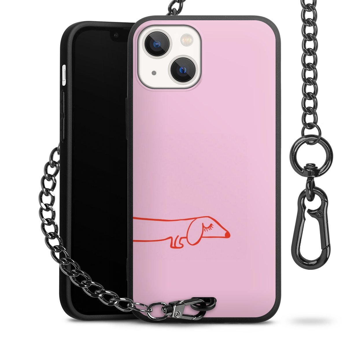 Die Handyhülle verfügt über eine mittig am unteren Rand platzierte Öse, an der die Metallkette stabil befestigt ist. Bestelle die Hülle einfach für Dein Smartphone-Modell, dann passt sie wie angegossen und Du brauchst sie bloß einmal anzudrücken. Handy in die Tasche, Karabiner an den Hosenbund – schon kann die Party starten.