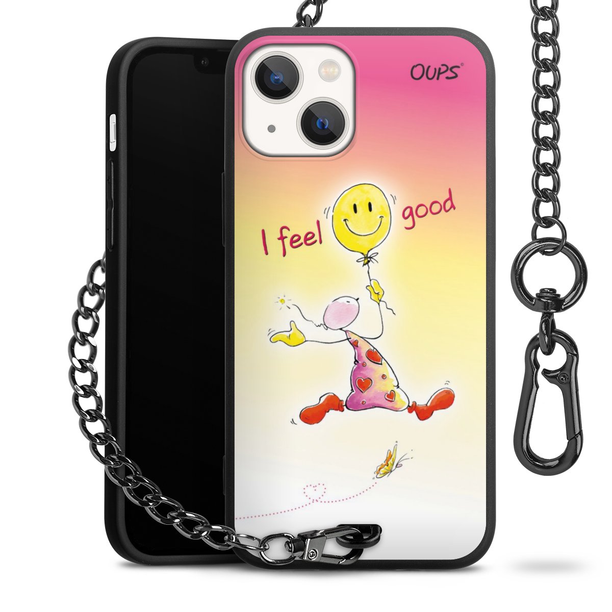 Die Handyhülle verfügt über eine mittig am unteren Rand platzierte Öse, an der die Metallkette stabil befestigt ist. Bestelle die Hülle einfach für Dein Smartphone-Modell, dann passt sie wie angegossen und Du brauchst sie bloß einmal anzudrücken. Handy in die Tasche, Karabiner an den Hosenbund – schon kann die Party starten.