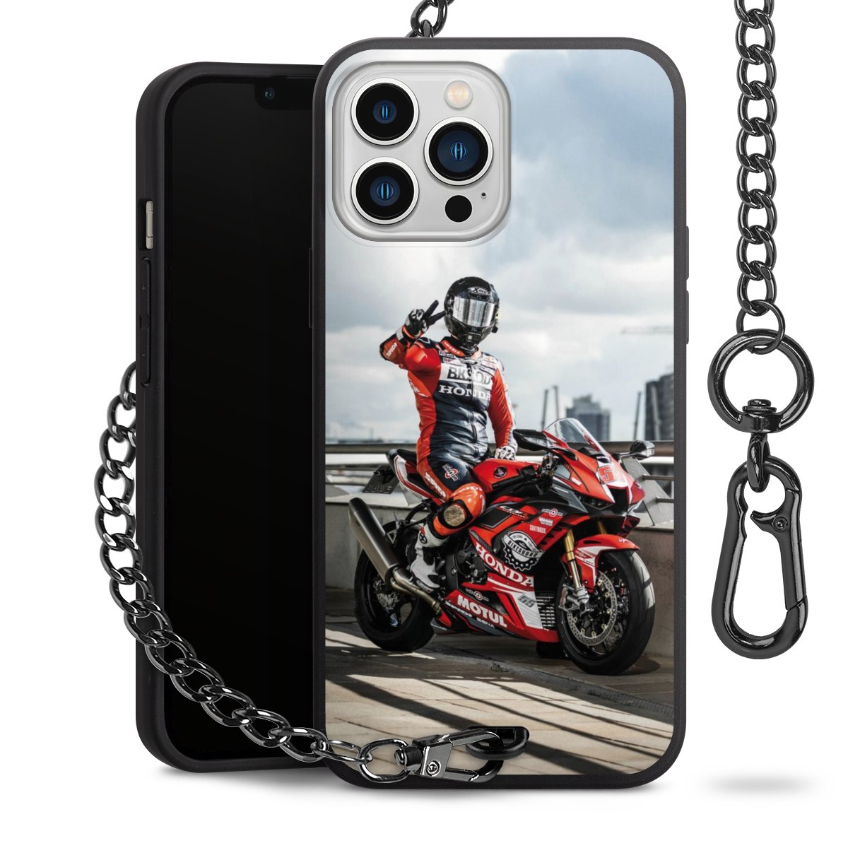 • Mattschwarze Handyhülle mit Metallkette