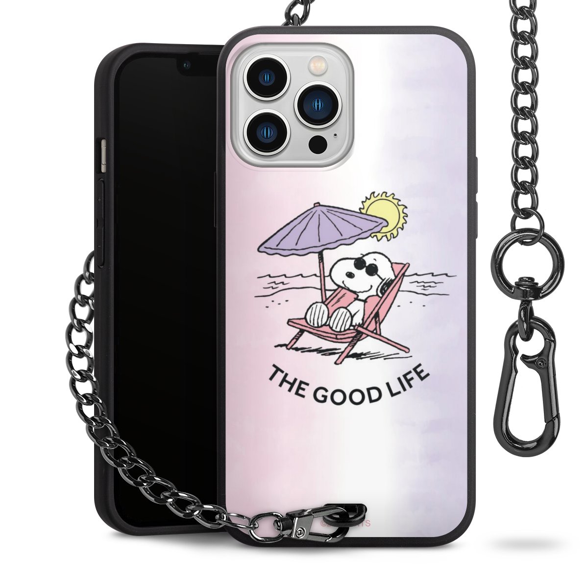 Die Handyhülle verfügt über eine mittig am unteren Rand platzierte Öse, an der die Metallkette stabil befestigt ist. Bestelle die Hülle einfach für Dein Smartphone-Modell, dann passt sie wie angegossen und Du brauchst sie bloß einmal anzudrücken. Handy in die Tasche, Karabiner an den Hosenbund – schon kann die Party starten.