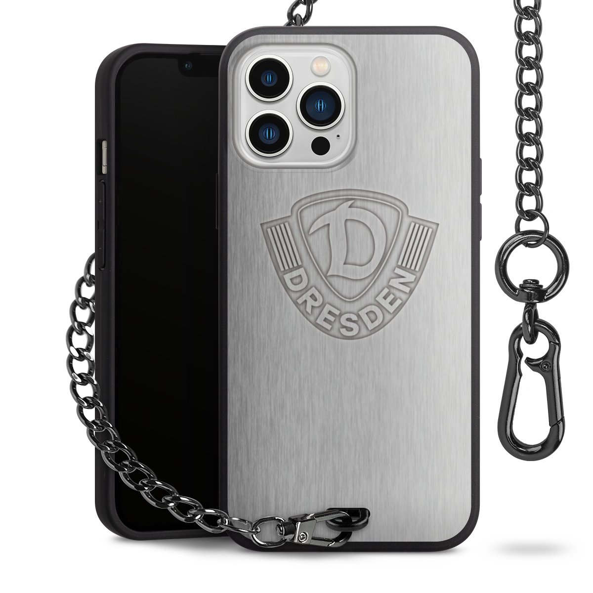 Die mattschwarze Silikon-Handyhülle besteht aus robustem TPU (thermoplastisches Polyurethan). Sie ist flexibel und schützt Dein Smartphone vor Stößen und Kratzern. Die Kette sowie der Karabinerhaken sind aus Metall in Gunmetal-Optik gefertigt. Für dieses Produkt kommen ausschließlich TÜV-geprüfte Materialien zum Einsatz.
