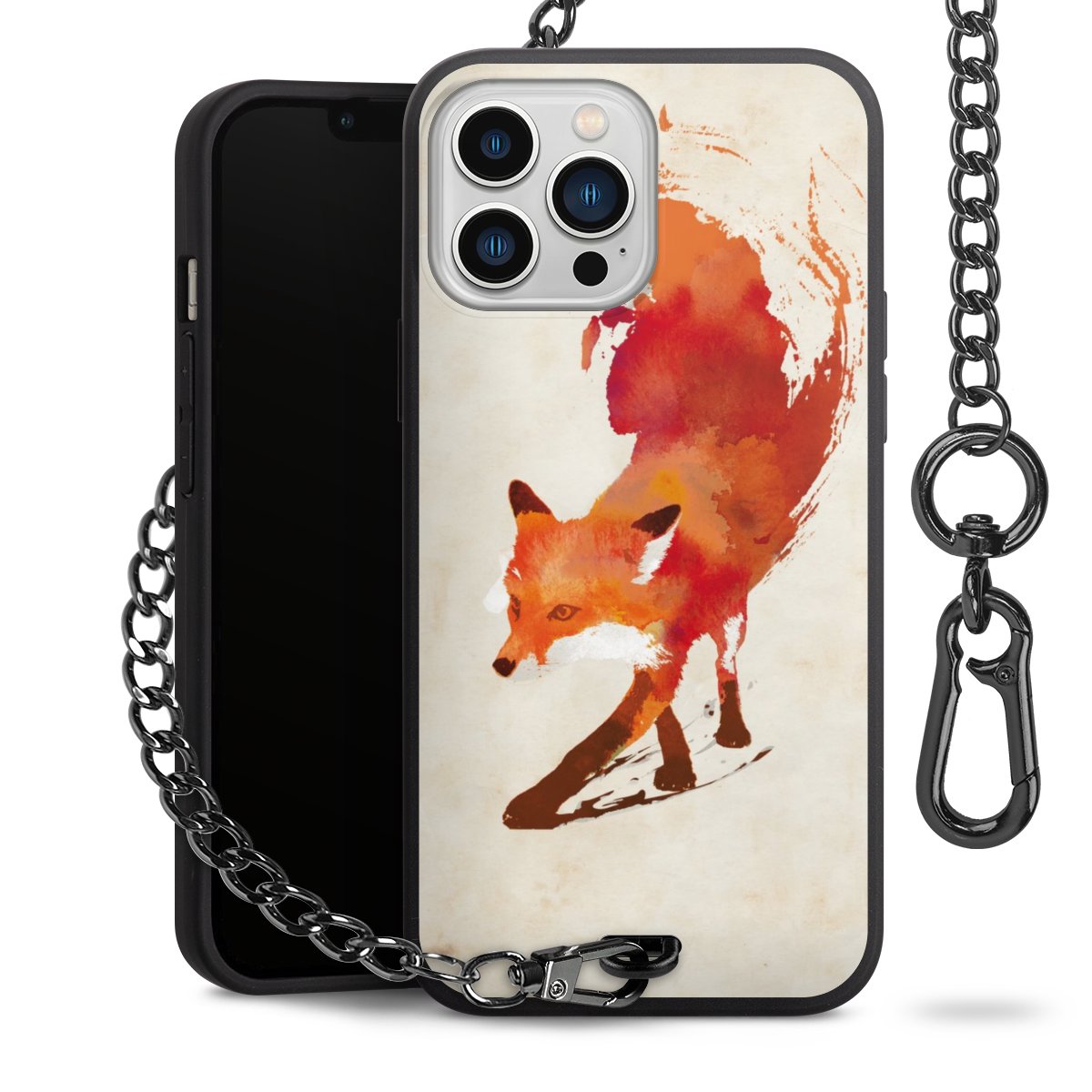 Die Handyhülle verfügt über eine mittig am unteren Rand platzierte Öse, an der die Metallkette stabil befestigt ist. Bestelle die Hülle einfach für Dein Smartphone-Modell, dann passt sie wie angegossen und Du brauchst sie bloß einmal anzudrücken. Handy in die Tasche, Karabiner an den Hosenbund – schon kann die Party starten.