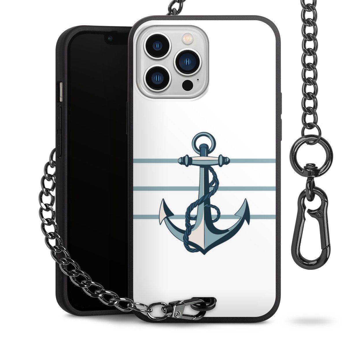 Die mattschwarze Silikon-Handyhülle besteht aus robustem TPU (thermoplastisches Polyurethan). Sie ist flexibel und schützt Dein Smartphone vor Stößen und Kratzern. Die Kette sowie der Karabinerhaken sind aus Metall in Gunmetal-Optik gefertigt. Für dieses Produkt kommen ausschließlich TÜV-geprüfte Materialien zum Einsatz.