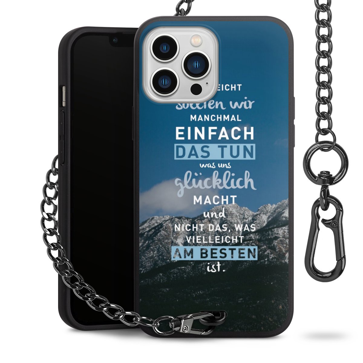 Die mattschwarze Silikon-Handyhülle besteht aus robustem TPU (thermoplastisches Polyurethan). Sie ist flexibel und schützt Dein Smartphone vor Stößen und Kratzern. Die Kette sowie der Karabinerhaken sind aus Metall in Gunmetal-Optik gefertigt. Für dieses Produkt kommen ausschließlich TÜV-geprüfte Materialien zum Einsatz.