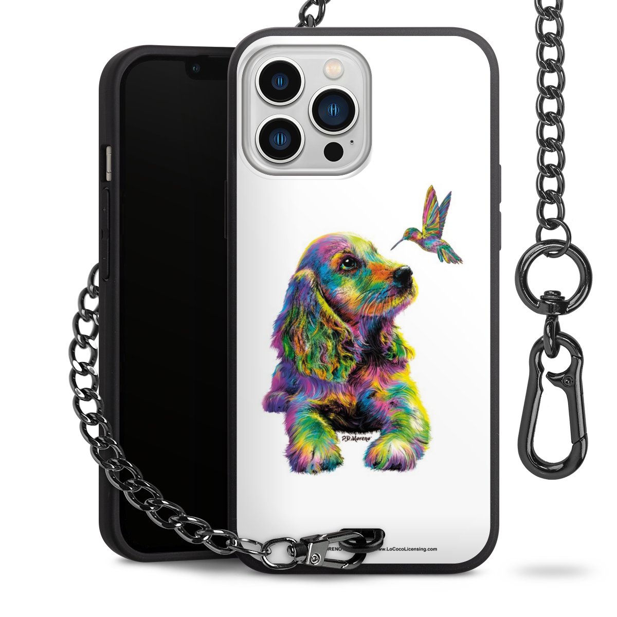 Die Handyhülle verfügt über eine mittig am unteren Rand platzierte Öse, an der die Metallkette stabil befestigt ist. Bestelle die Hülle einfach für Dein Smartphone-Modell, dann passt sie wie angegossen und Du brauchst sie bloß einmal anzudrücken. Handy in die Tasche, Karabiner an den Hosenbund – schon kann die Party starten.