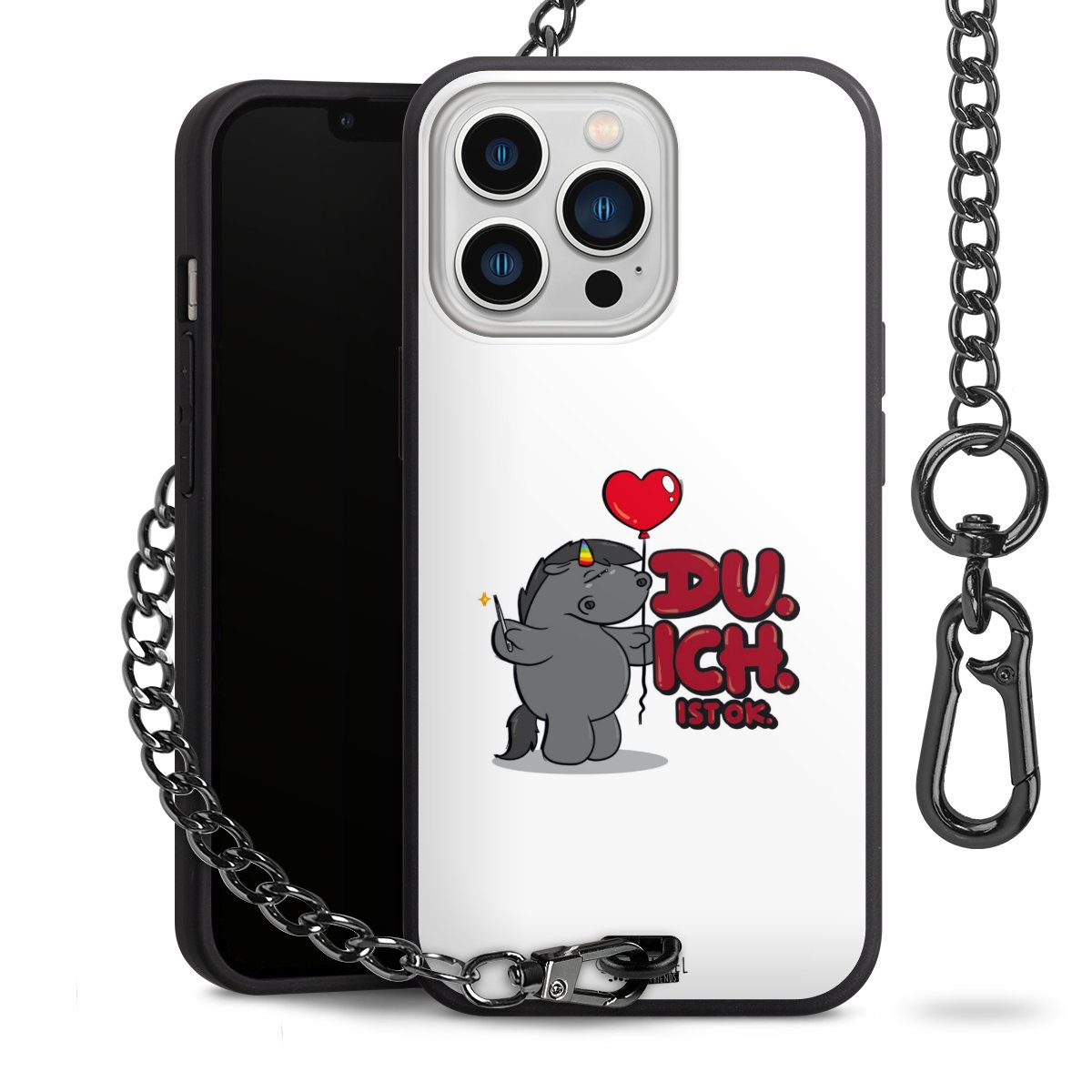 Die mattschwarze Silikon-Handyhülle besteht aus robustem TPU (thermoplastisches Polyurethan). Sie ist flexibel und schützt Dein Smartphone vor Stößen und Kratzern. Die Kette sowie der Karabinerhaken sind aus Metall in Gunmetal-Optik gefertigt. Für dieses Produkt kommen ausschließlich TÜV-geprüfte Materialien zum Einsatz.