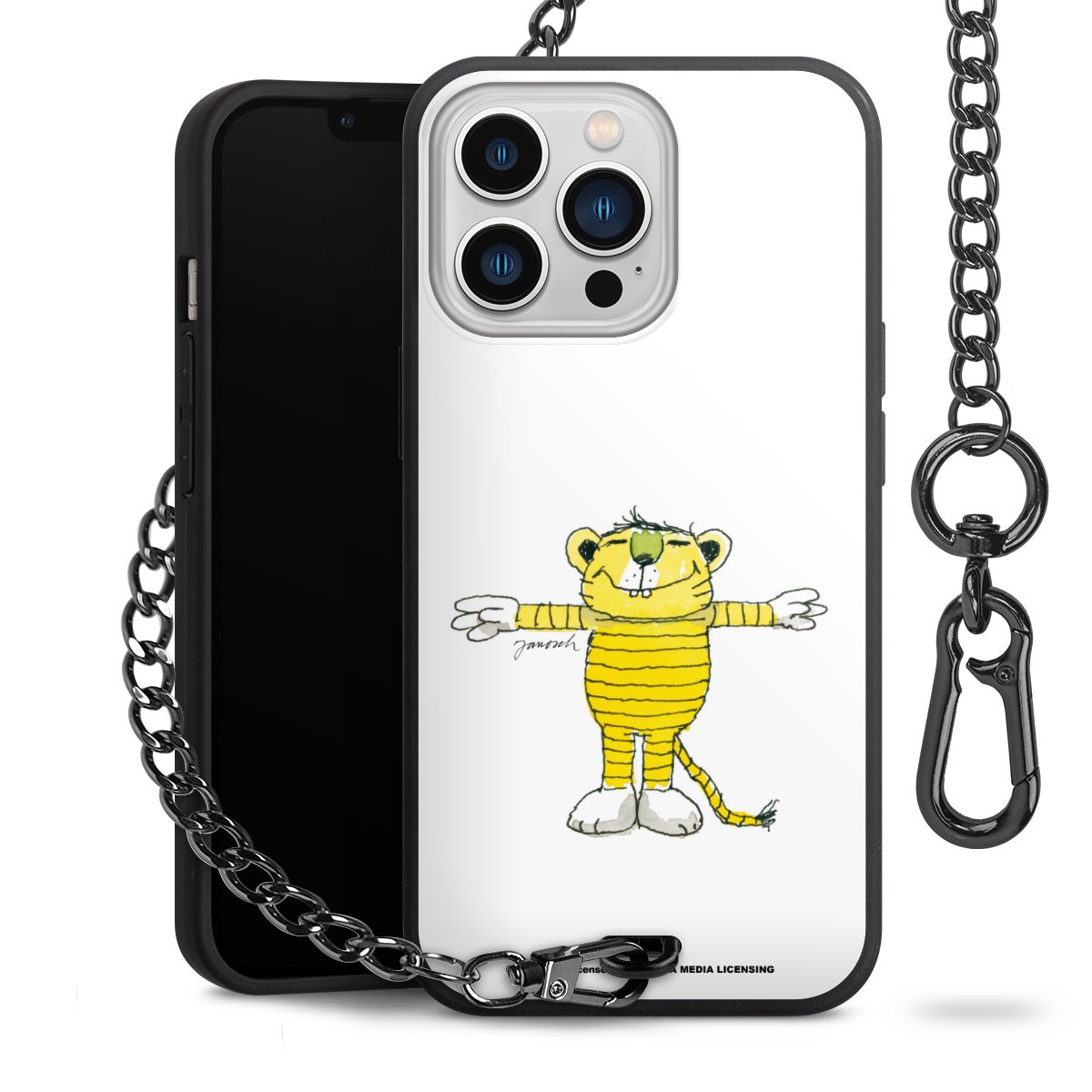 Die mattschwarze Silikon-Handyhülle besteht aus robustem TPU (thermoplastisches Polyurethan). Sie ist flexibel und schützt Dein Smartphone vor Stößen und Kratzern. Die Kette sowie der Karabinerhaken sind aus Metall in Gunmetal-Optik gefertigt. Für dieses Produkt kommen ausschließlich TÜV-geprüfte Materialien zum Einsatz.