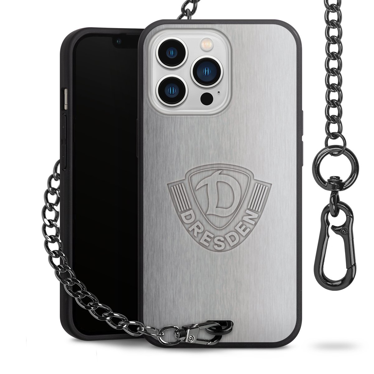Die mattschwarze Silikon-Handyhülle besteht aus robustem TPU (thermoplastisches Polyurethan). Sie ist flexibel und schützt Dein Smartphone vor Stößen und Kratzern. Die Kette sowie der Karabinerhaken sind aus Metall in Gunmetal-Optik gefertigt. Für dieses Produkt kommen ausschließlich TÜV-geprüfte Materialien zum Einsatz.