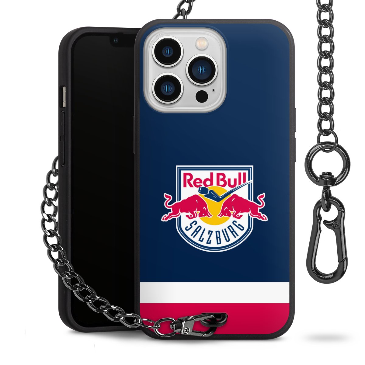 Die Handyhülle verfügt über eine mittig am unteren Rand platzierte Öse, an der die Metallkette stabil befestigt ist. Bestelle die Hülle einfach für Dein Smartphone-Modell, dann passt sie wie angegossen und Du brauchst sie bloß einmal anzudrücken. Handy in die Tasche, Karabiner an den Hosenbund – schon kann die Party starten.