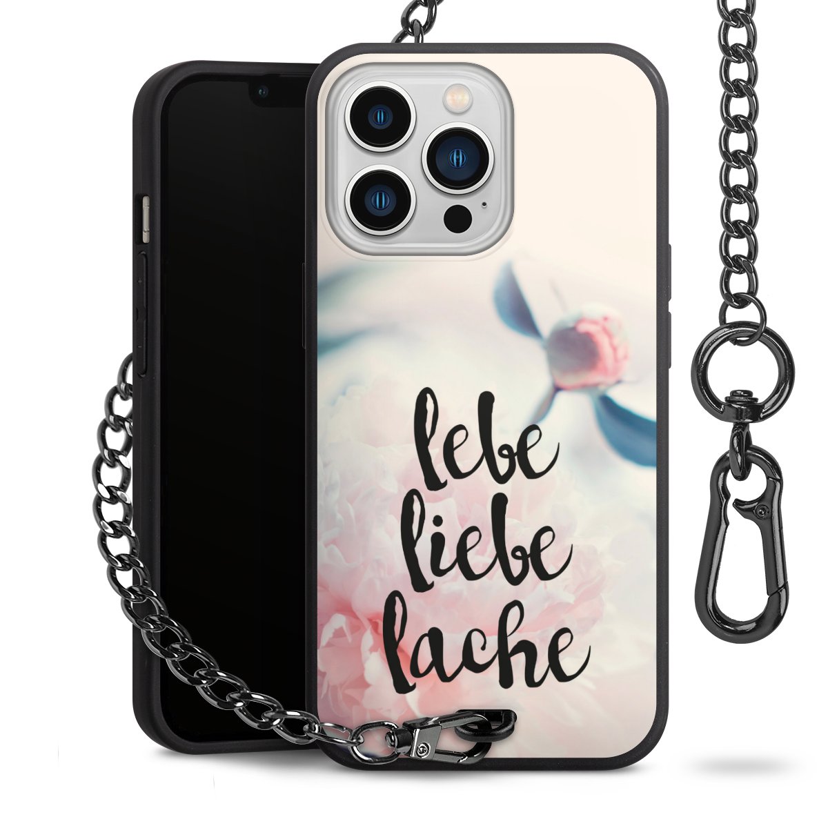 Die mattschwarze Silikon-Handyhülle besteht aus robustem TPU (thermoplastisches Polyurethan). Sie ist flexibel und schützt Dein Smartphone vor Stößen und Kratzern. Die Kette sowie der Karabinerhaken sind aus Metall in Gunmetal-Optik gefertigt. Für dieses Produkt kommen ausschließlich TÜV-geprüfte Materialien zum Einsatz.