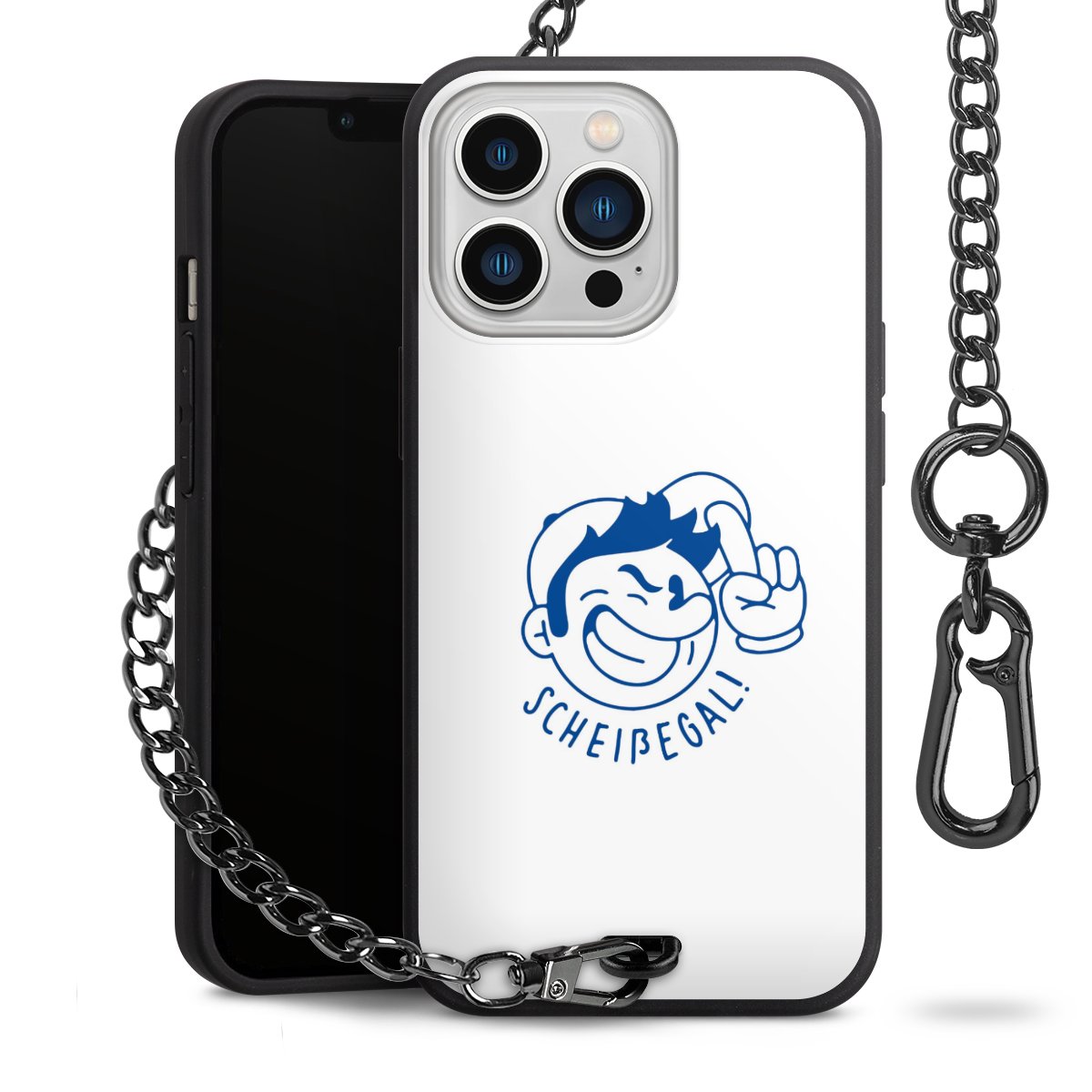 Die Handyhülle verfügt über eine mittig am unteren Rand platzierte Öse, an der die Metallkette stabil befestigt ist. Bestelle die Hülle einfach für Dein Smartphone-Modell, dann passt sie wie angegossen und Du brauchst sie bloß einmal anzudrücken. Handy in die Tasche, Karabiner an den Hosenbund – schon kann die Party starten.
