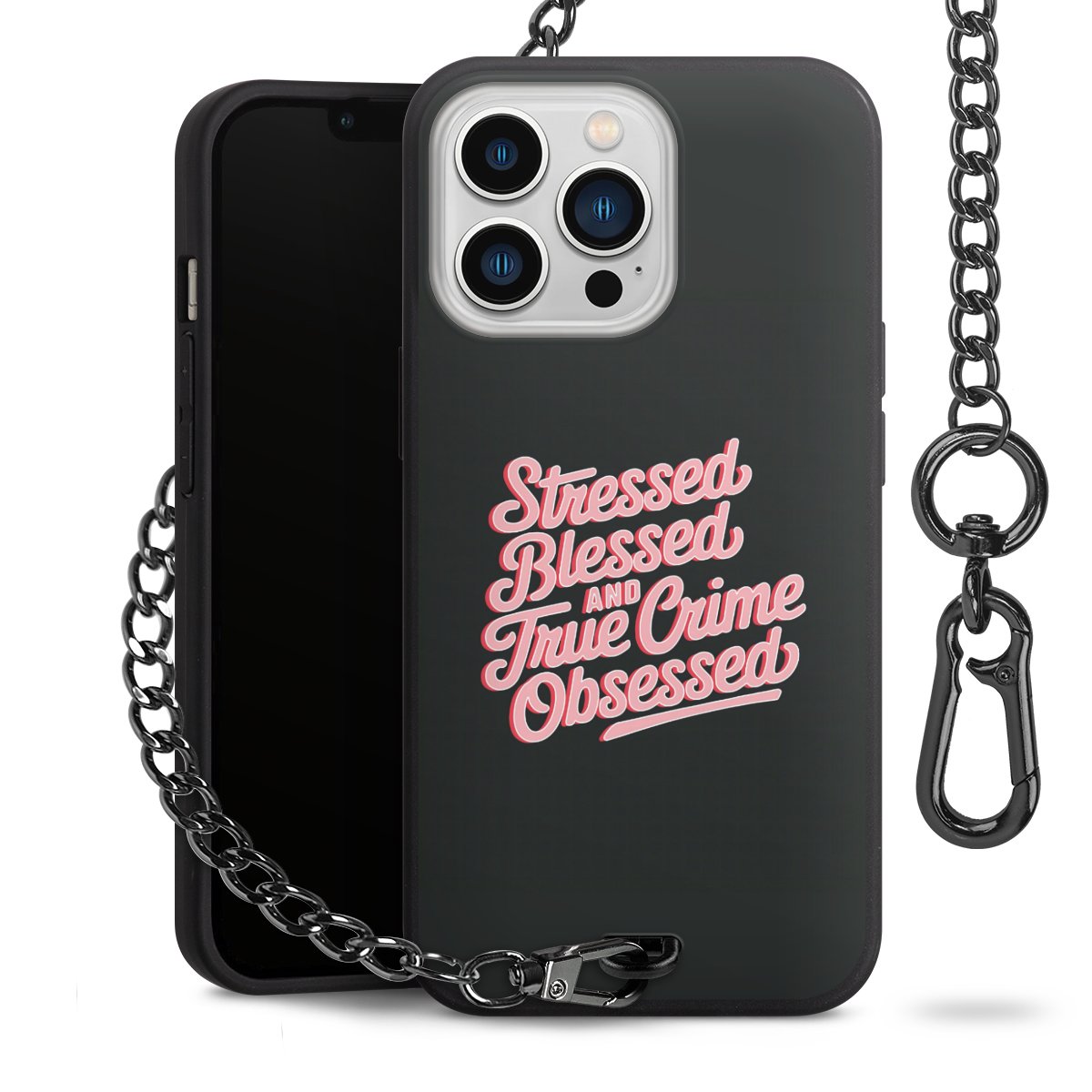 Die mattschwarze Silikon-Handyhülle besteht aus robustem TPU (thermoplastisches Polyurethan). Sie ist flexibel und schützt Dein Smartphone vor Stößen und Kratzern. Die Kette sowie der Karabinerhaken sind aus Metall in Gunmetal-Optik gefertigt. Für dieses Produkt kommen ausschließlich TÜV-geprüfte Materialien zum Einsatz.