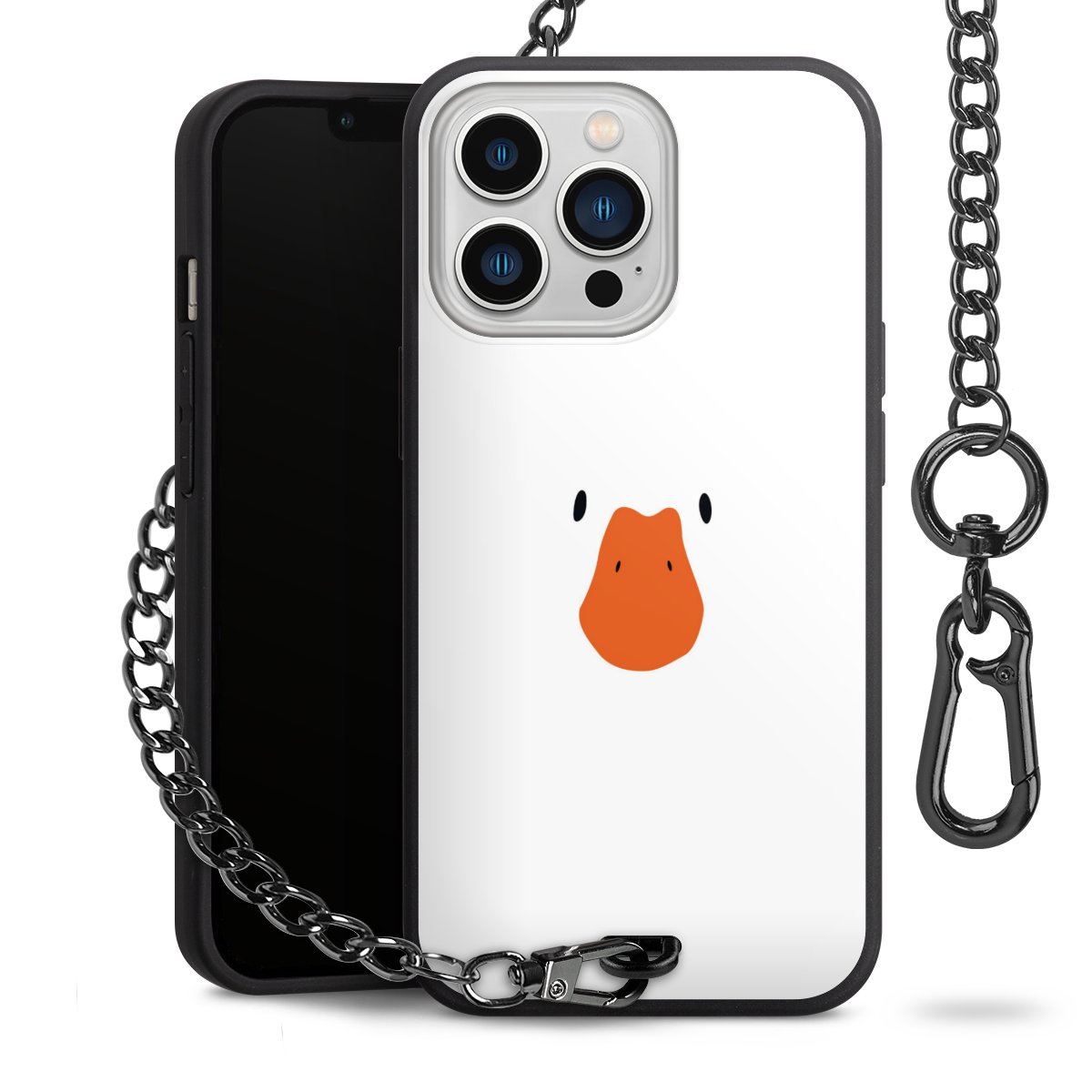 Die mattschwarze Silikon-Handyhülle besteht aus robustem TPU (thermoplastisches Polyurethan). Sie ist flexibel und schützt Dein Smartphone vor Stößen und Kratzern. Die Kette sowie der Karabinerhaken sind aus Metall in Gunmetal-Optik gefertigt. Für dieses Produkt kommen ausschließlich TÜV-geprüfte Materialien zum Einsatz.