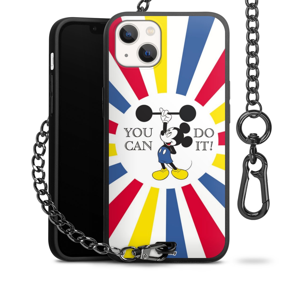 Die Handyhülle verfügt über eine mittig am unteren Rand platzierte Öse, an der die Metallkette stabil befestigt ist. Bestelle die Hülle einfach für Dein Smartphone-Modell, dann passt sie wie angegossen und Du brauchst sie bloß einmal anzudrücken. Handy in die Tasche, Karabiner an den Hosenbund – schon kann die Party starten.