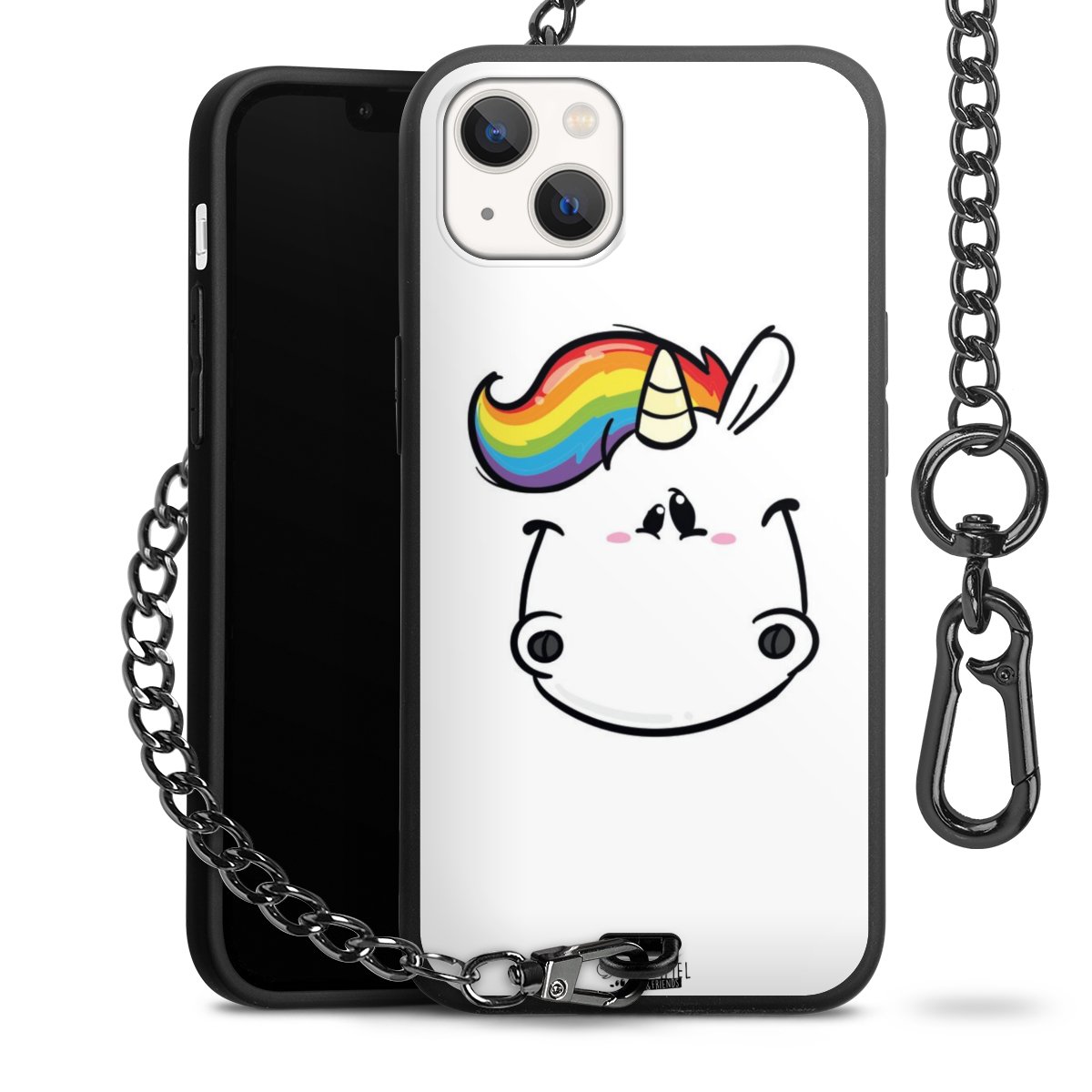 Die Handyhülle verfügt über eine mittig am unteren Rand platzierte Öse, an der die Metallkette stabil befestigt ist. Bestelle die Hülle einfach für Dein Smartphone-Modell, dann passt sie wie angegossen und Du brauchst sie bloß einmal anzudrücken. Handy in die Tasche, Karabiner an den Hosenbund – schon kann die Party starten.