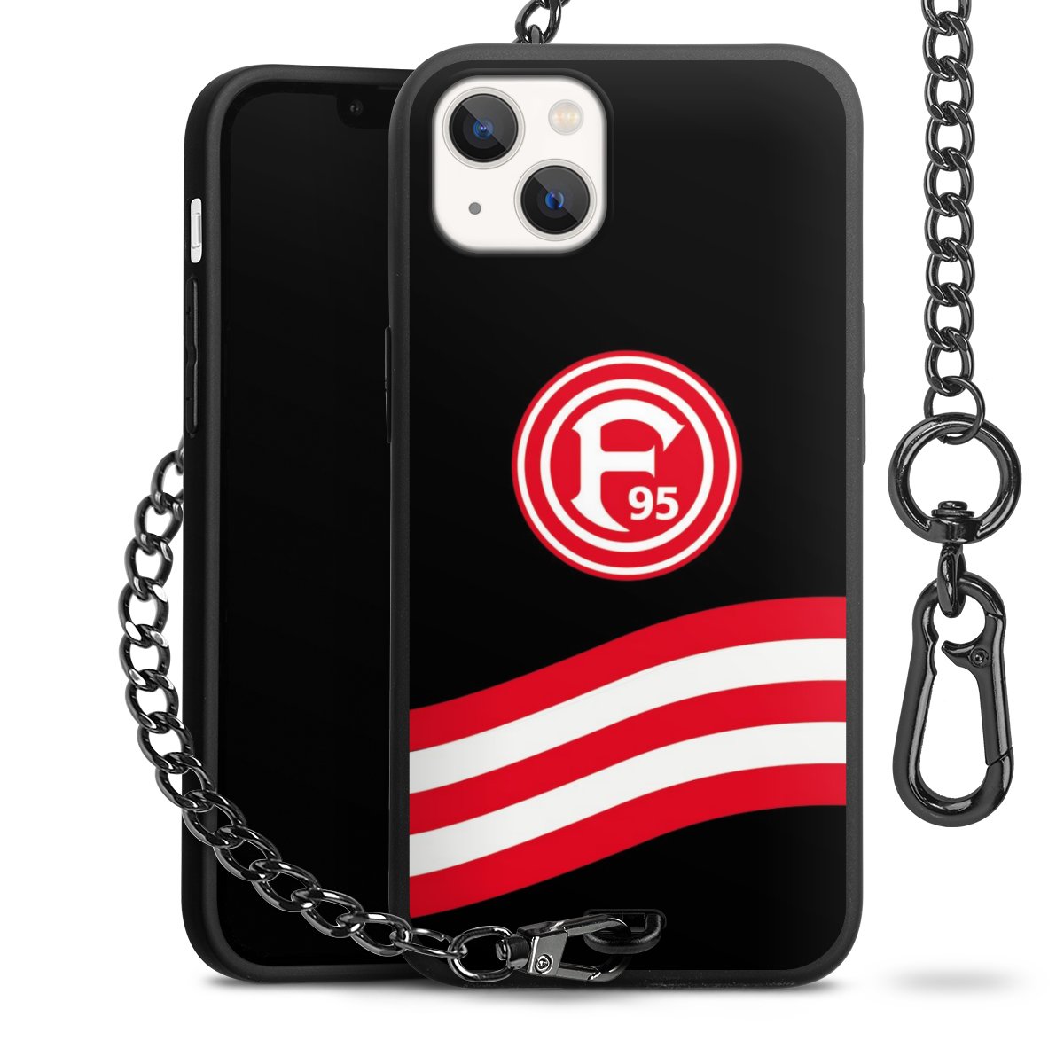 Die Handyhülle verfügt über eine mittig am unteren Rand platzierte Öse, an der die Metallkette stabil befestigt ist. Bestelle die Hülle einfach für Dein Smartphone-Modell, dann passt sie wie angegossen und Du brauchst sie bloß einmal anzudrücken. Handy in die Tasche, Karabiner an den Hosenbund – schon kann die Party starten.