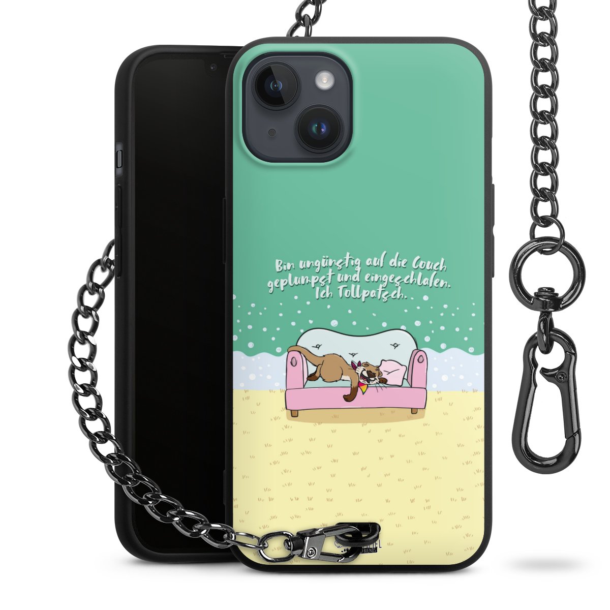 Die mattschwarze Silikon-Handyhülle besteht aus robustem TPU (thermoplastisches Polyurethan). Sie ist flexibel und schützt Dein Smartphone vor Stößen und Kratzern. Die Kette sowie der Karabinerhaken sind aus Metall in Gunmetal-Optik gefertigt. Für dieses Produkt kommen ausschließlich TÜV-geprüfte Materialien zum Einsatz.