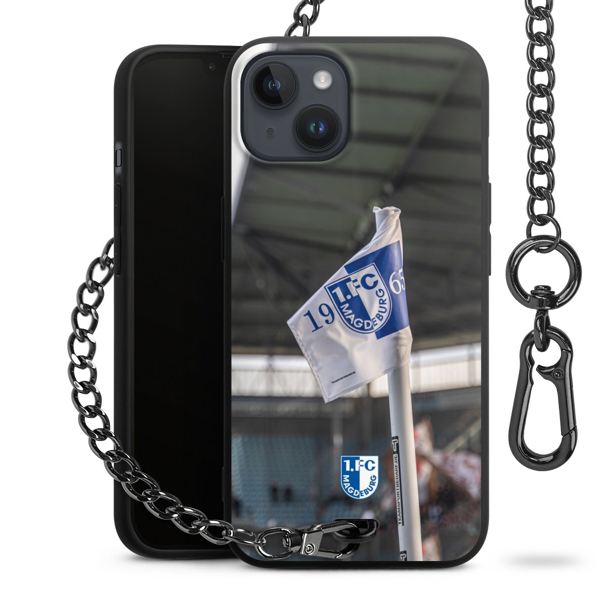 Die Handyhülle verfügt über eine mittig am unteren Rand platzierte Öse, an der die Metallkette stabil befestigt ist. Bestelle die Hülle einfach für Dein Smartphone-Modell, dann passt sie wie angegossen und Du brauchst sie bloß einmal anzudrücken. Handy in die Tasche, Karabiner an den Hosenbund – schon kann die Party starten.