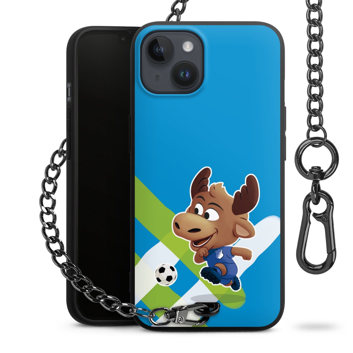 Die Handyhülle verfügt über eine mittig am unteren Rand platzierte Öse, an der die Metallkette stabil befestigt ist. Bestelle die Hülle einfach für Dein Smartphone-Modell, dann passt sie wie angegossen und Du brauchst sie bloß einmal anzudrücken. Handy in die Tasche, Karabiner an den Hosenbund – schon kann die Party starten.