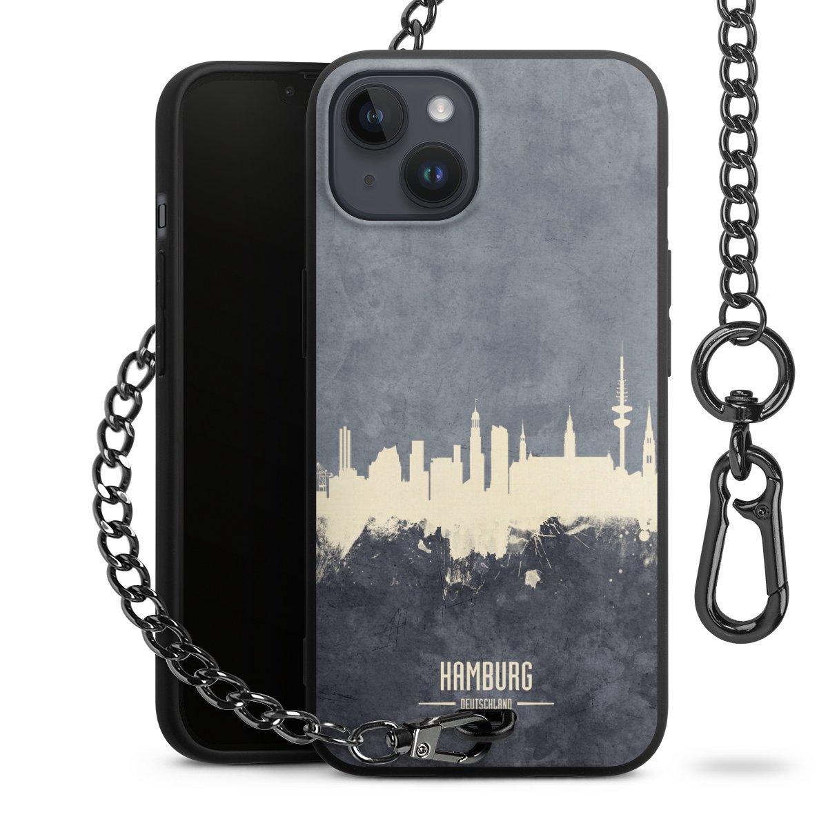 Die mattschwarze Silikon-Handyhülle besteht aus robustem TPU (thermoplastisches Polyurethan). Sie ist flexibel und schützt Dein Smartphone vor Stößen und Kratzern. Die Kette sowie der Karabinerhaken sind aus Metall in Gunmetal-Optik gefertigt. Für dieses Produkt kommen ausschließlich TÜV-geprüfte Materialien zum Einsatz.