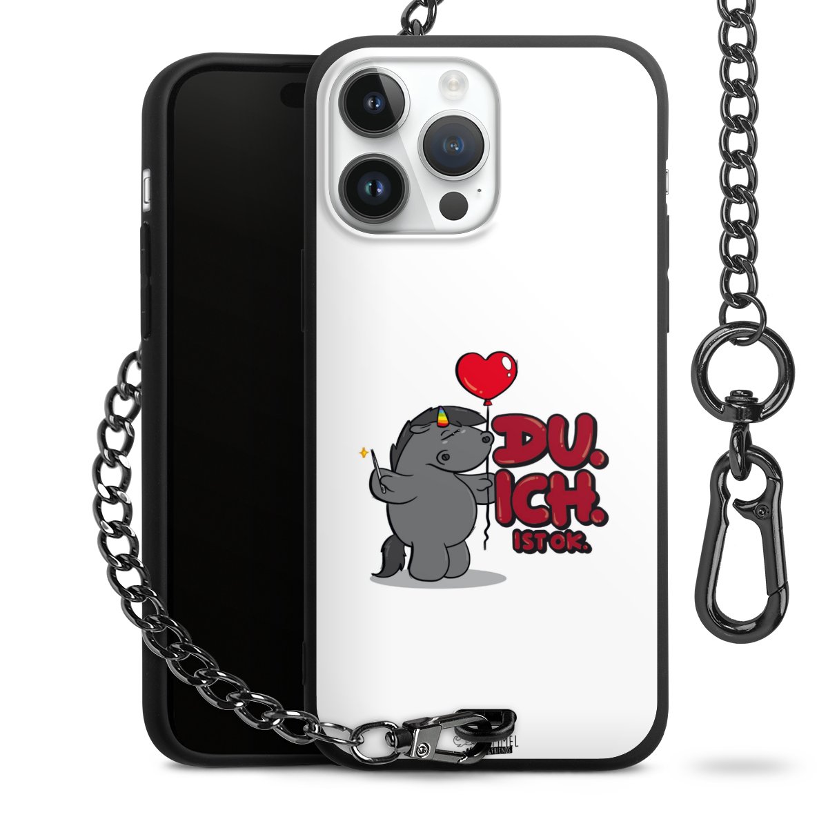 Die mattschwarze Silikon-Handyhülle besteht aus robustem TPU (thermoplastisches Polyurethan). Sie ist flexibel und schützt Dein Smartphone vor Stößen und Kratzern. Die Kette sowie der Karabinerhaken sind aus Metall in Gunmetal-Optik gefertigt. Für dieses Produkt kommen ausschließlich TÜV-geprüfte Materialien zum Einsatz.