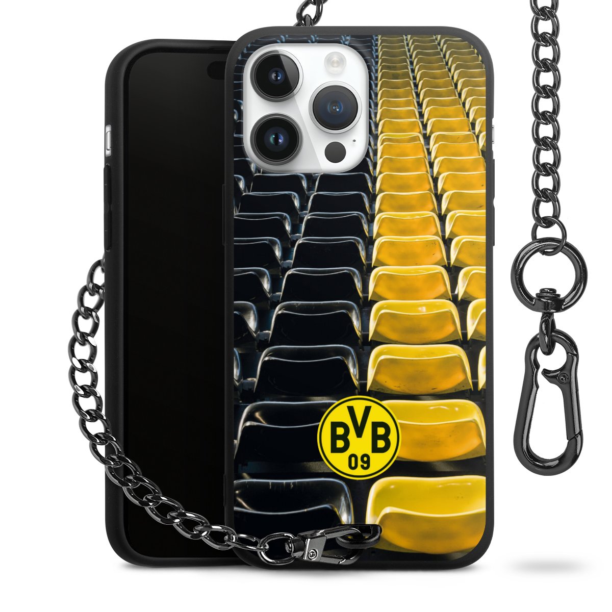 Die mattschwarze Silikon-Handyhülle besteht aus robustem TPU (thermoplastisches Polyurethan). Sie ist flexibel und schützt Dein Smartphone vor Stößen und Kratzern. Die Kette sowie der Karabinerhaken sind aus Metall in Gunmetal-Optik gefertigt. Für dieses Produkt kommen ausschließlich TÜV-geprüfte Materialien zum Einsatz.