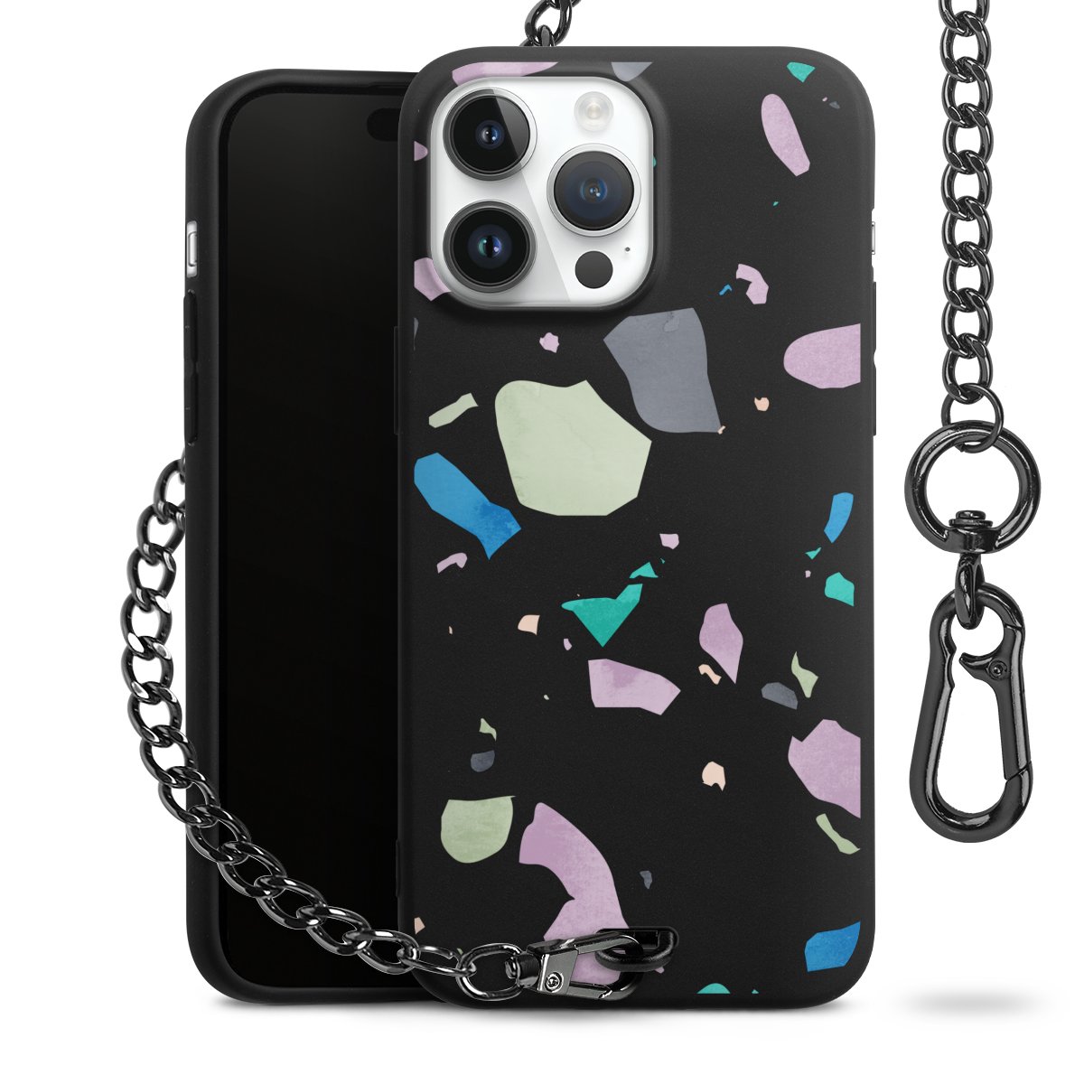 Die mattschwarze Silikon-Handyhülle besteht aus robustem TPU (thermoplastisches Polyurethan). Sie ist flexibel und schützt Dein Smartphone vor Stößen und Kratzern. Die Kette sowie der Karabinerhaken sind aus Metall in Gunmetal-Optik gefertigt. Für dieses Produkt kommen ausschließlich TÜV-geprüfte Materialien zum Einsatz.