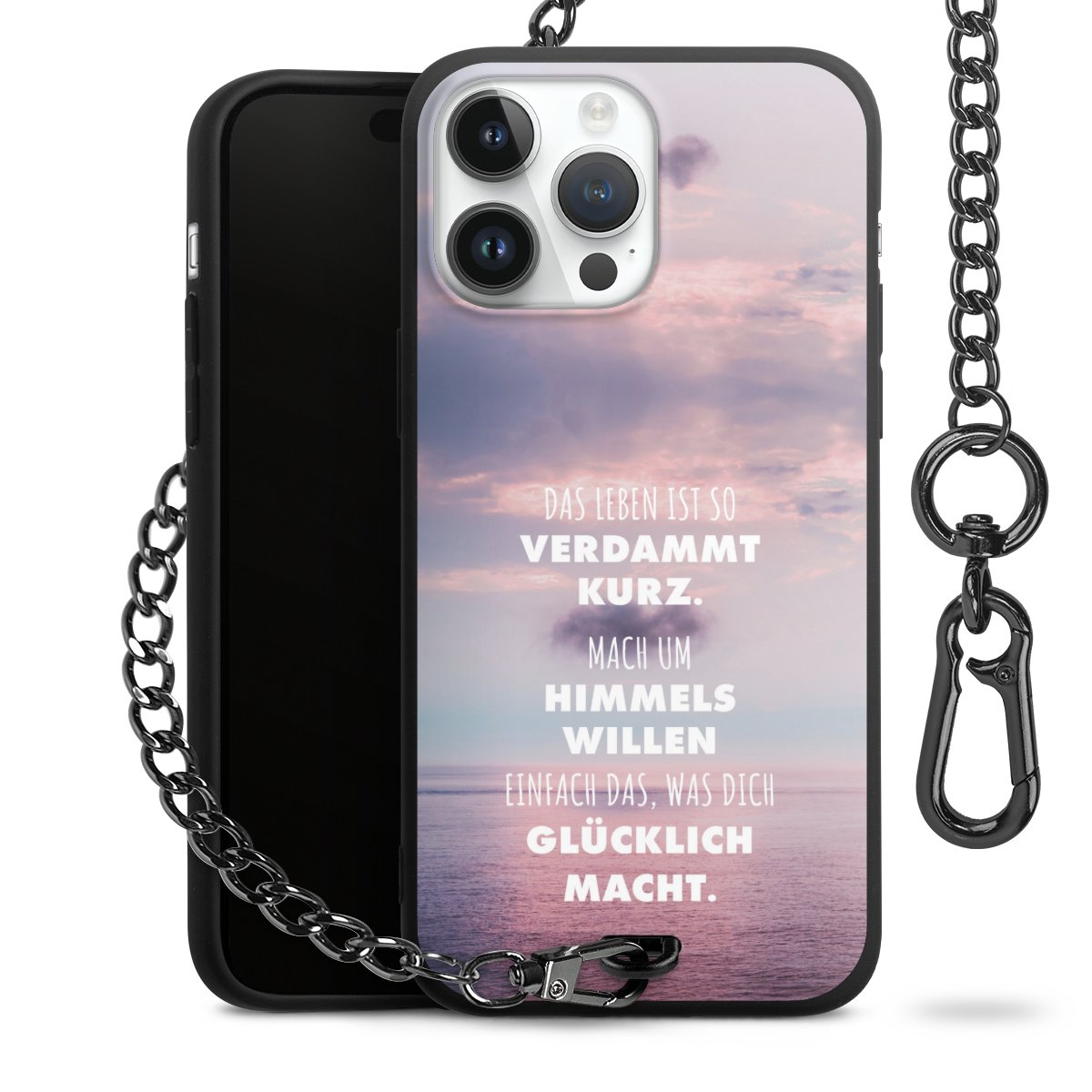 Die mattschwarze Silikon-Handyhülle besteht aus robustem TPU (thermoplastisches Polyurethan). Sie ist flexibel und schützt Dein Smartphone vor Stößen und Kratzern. Die Kette sowie der Karabinerhaken sind aus Metall in Gunmetal-Optik gefertigt. Für dieses Produkt kommen ausschließlich TÜV-geprüfte Materialien zum Einsatz.