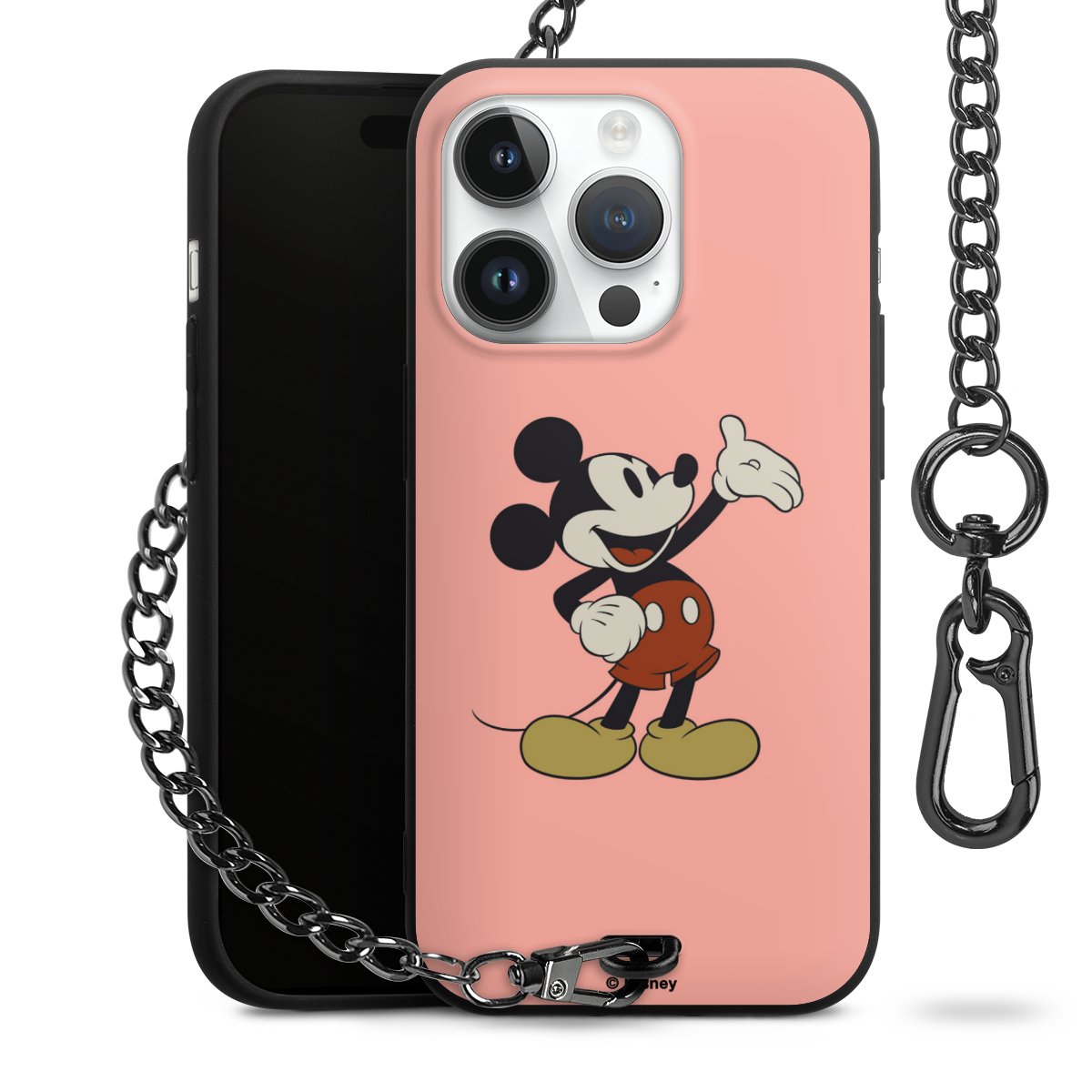 Die Handyhülle verfügt über eine mittig am unteren Rand platzierte Öse, an der die Metallkette stabil befestigt ist. Bestelle die Hülle einfach für Dein Smartphone-Modell, dann passt sie wie angegossen und Du brauchst sie bloß einmal anzudrücken. Handy in die Tasche, Karabiner an den Hosenbund – schon kann die Party starten.