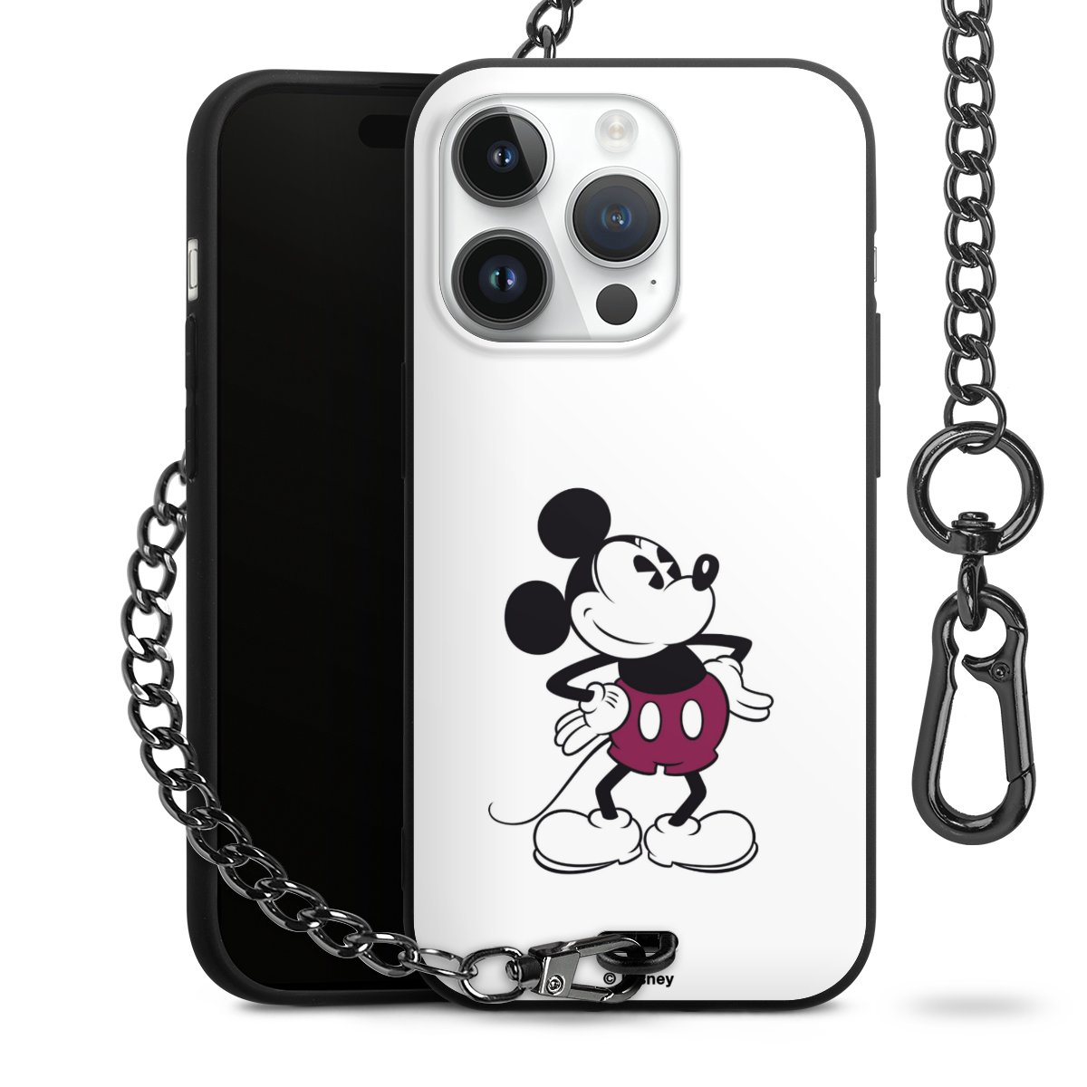 Die Handyhülle verfügt über eine mittig am unteren Rand platzierte Öse, an der die Metallkette stabil befestigt ist. Bestelle die Hülle einfach für Dein Smartphone-Modell, dann passt sie wie angegossen und Du brauchst sie bloß einmal anzudrücken. Handy in die Tasche, Karabiner an den Hosenbund – schon kann die Party starten.