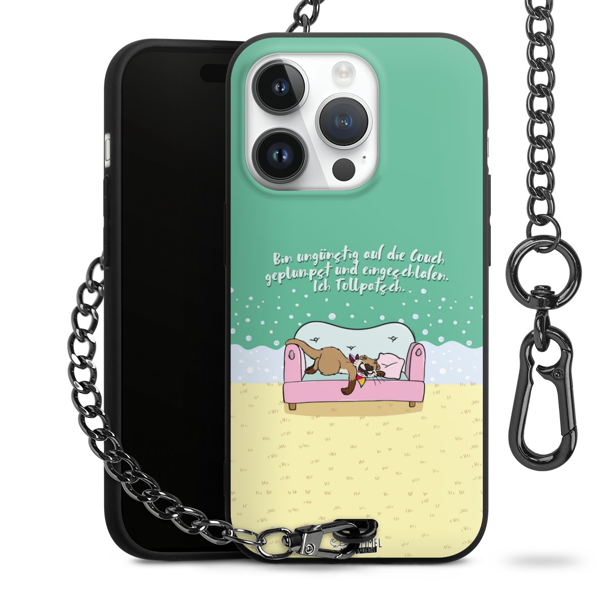 Die mattschwarze Silikon-Handyhülle besteht aus robustem TPU (thermoplastisches Polyurethan). Sie ist flexibel und schützt Dein Smartphone vor Stößen und Kratzern. Die Kette sowie der Karabinerhaken sind aus Metall in Gunmetal-Optik gefertigt. Für dieses Produkt kommen ausschließlich TÜV-geprüfte Materialien zum Einsatz.