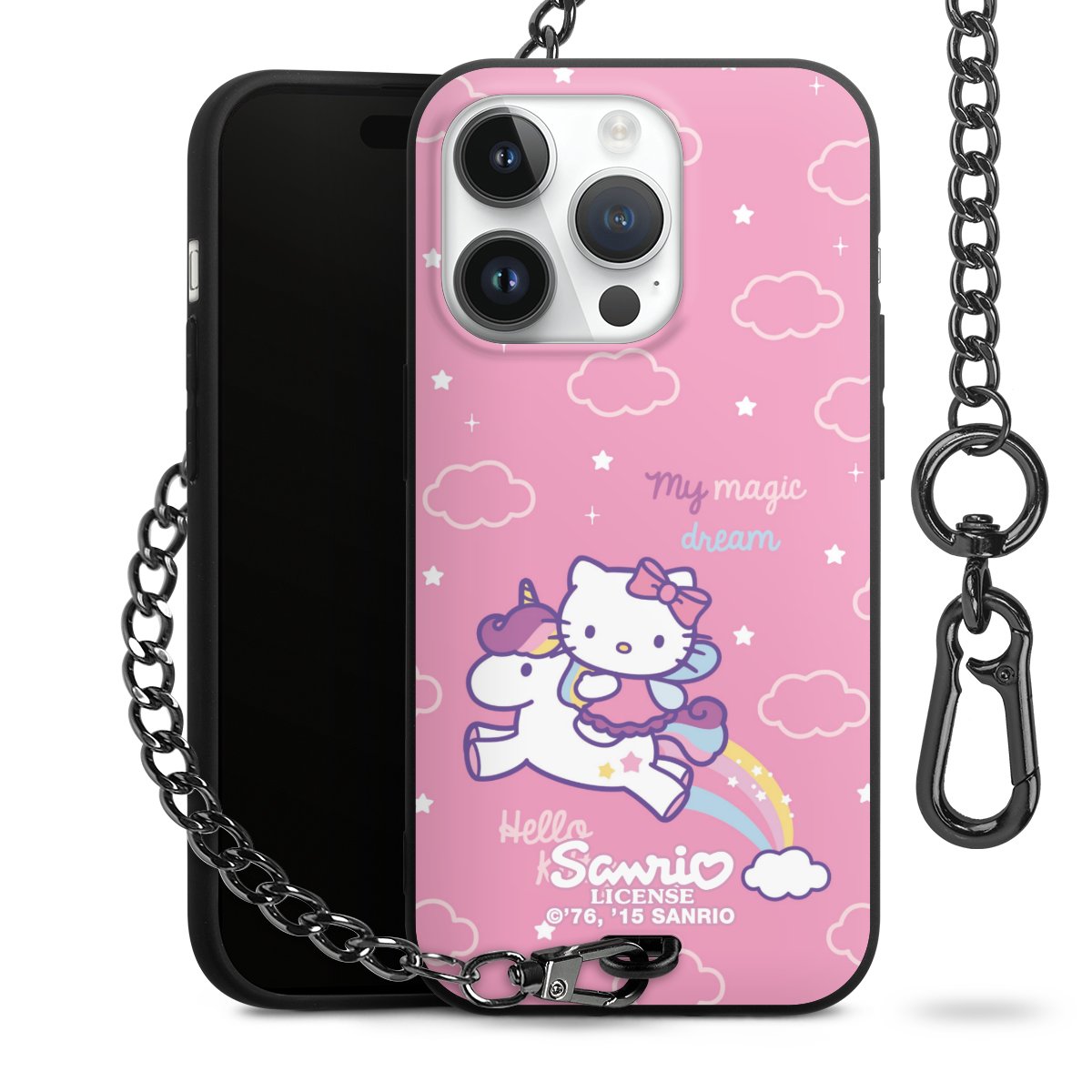 Die Handyhülle verfügt über eine mittig am unteren Rand platzierte Öse, an der die Metallkette stabil befestigt ist. Bestelle die Hülle einfach für Dein Smartphone-Modell, dann passt sie wie angegossen und Du brauchst sie bloß einmal anzudrücken. Handy in die Tasche, Karabiner an den Hosenbund – schon kann die Party starten.