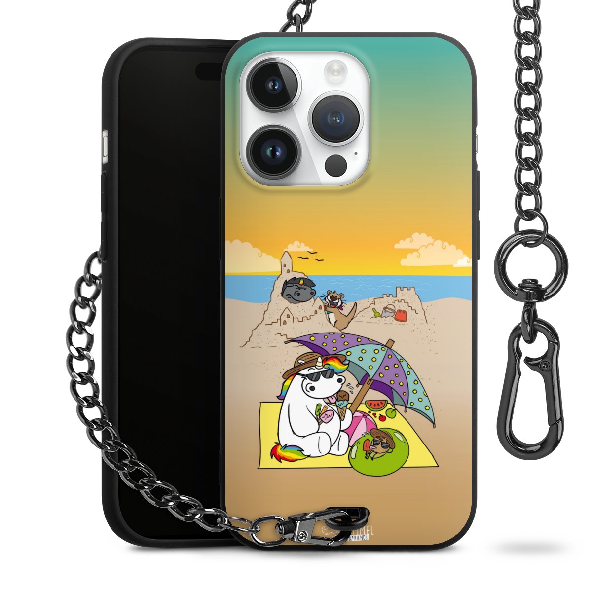 Die Handyhülle verfügt über eine mittig am unteren Rand platzierte Öse, an der die Metallkette stabil befestigt ist. Bestelle die Hülle einfach für Dein Smartphone-Modell, dann passt sie wie angegossen und Du brauchst sie bloß einmal anzudrücken. Handy in die Tasche, Karabiner an den Hosenbund – schon kann die Party starten.