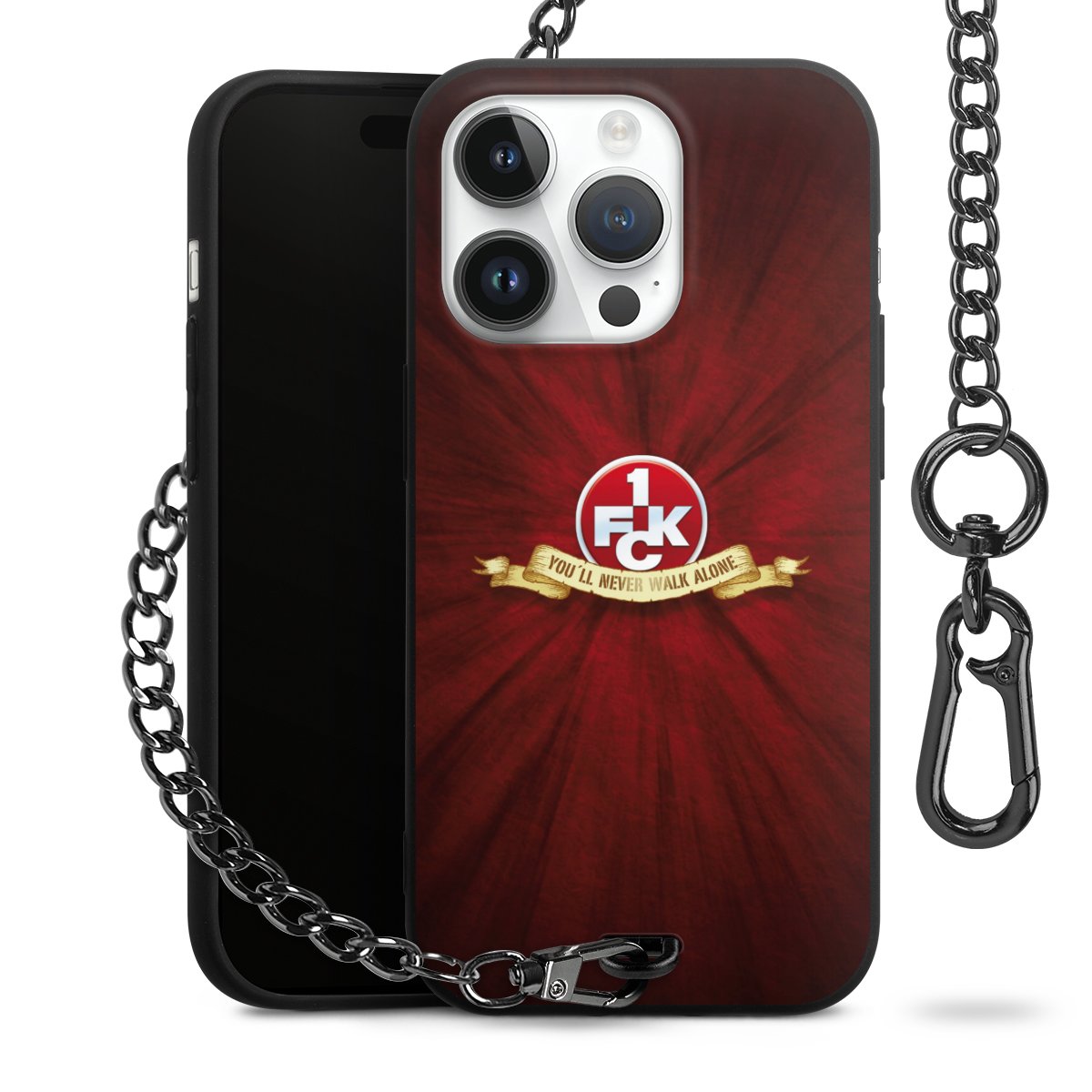 Die Handyhülle verfügt über eine mittig am unteren Rand platzierte Öse, an der die Metallkette stabil befestigt ist. Bestelle die Hülle einfach für Dein Smartphone-Modell, dann passt sie wie angegossen und Du brauchst sie bloß einmal anzudrücken. Handy in die Tasche, Karabiner an den Hosenbund – schon kann die Party starten.
