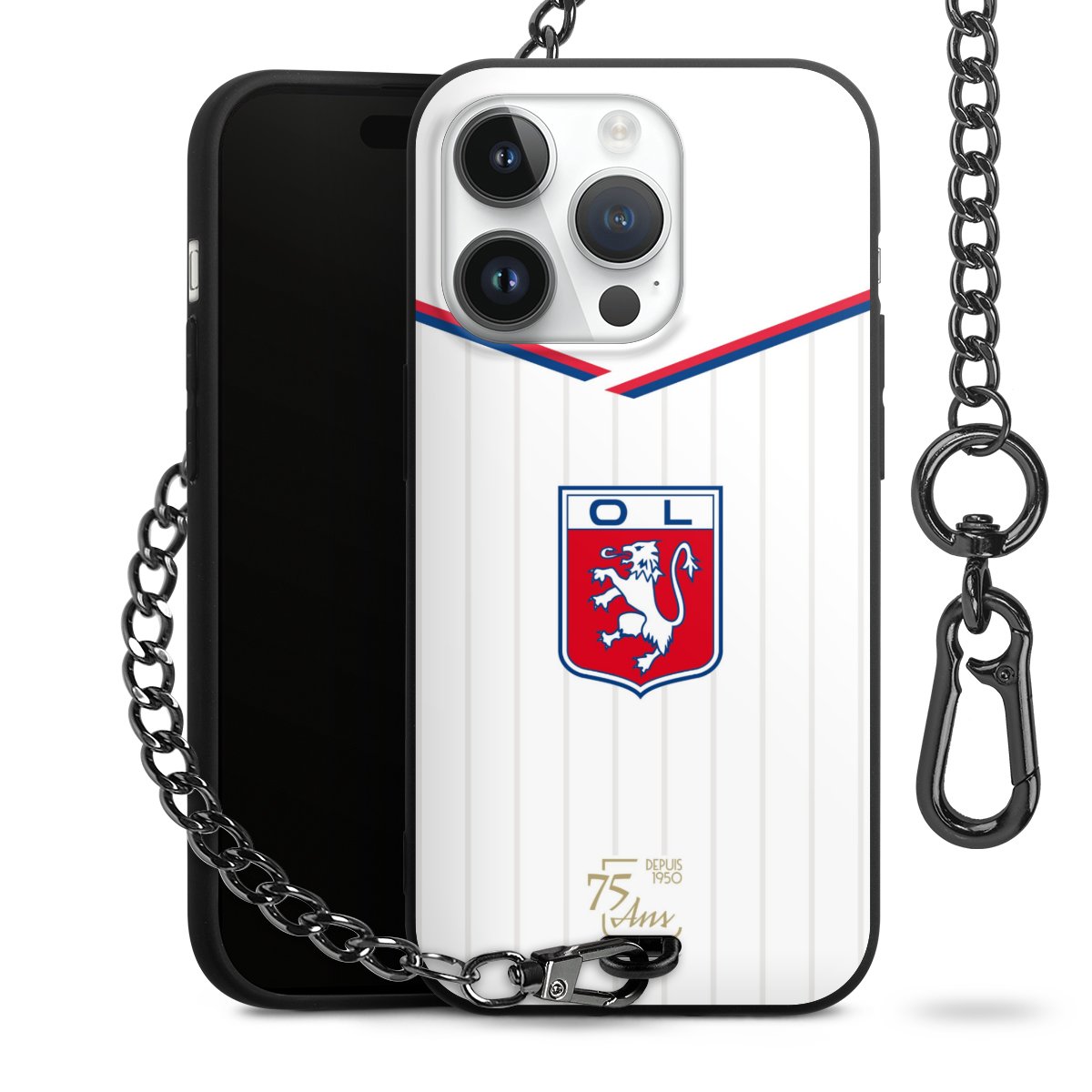 Die Handyhülle verfügt über eine mittig am unteren Rand platzierte Öse, an der die Metallkette stabil befestigt ist. Bestelle die Hülle einfach für Dein Smartphone-Modell, dann passt sie wie angegossen und Du brauchst sie bloß einmal anzudrücken. Handy in die Tasche, Karabiner an den Hosenbund – schon kann die Party starten.