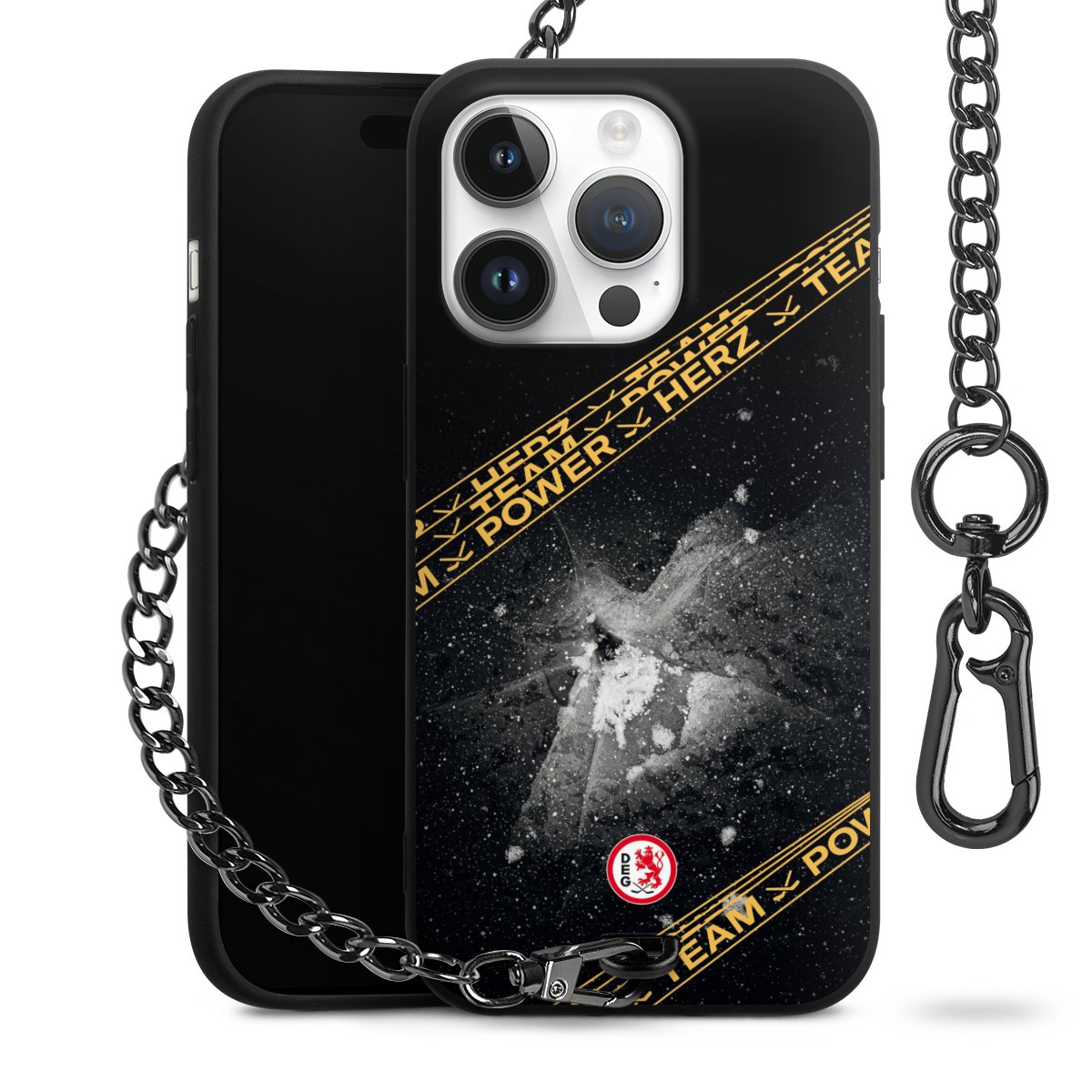 Die mattschwarze Silikon-Handyhülle besteht aus robustem TPU (thermoplastisches Polyurethan). Sie ist flexibel und schützt Dein Smartphone vor Stößen und Kratzern. Die Kette sowie der Karabinerhaken sind aus Metall in Gunmetal-Optik gefertigt. Für dieses Produkt kommen ausschließlich TÜV-geprüfte Materialien zum Einsatz.
