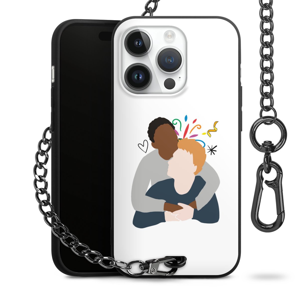 Die Handyhülle verfügt über eine mittig am unteren Rand platzierte Öse, an der die Metallkette stabil befestigt ist. Bestelle die Hülle einfach für Dein Smartphone-Modell, dann passt sie wie angegossen und Du brauchst sie bloß einmal anzudrücken. Handy in die Tasche, Karabiner an den Hosenbund – schon kann die Party starten.