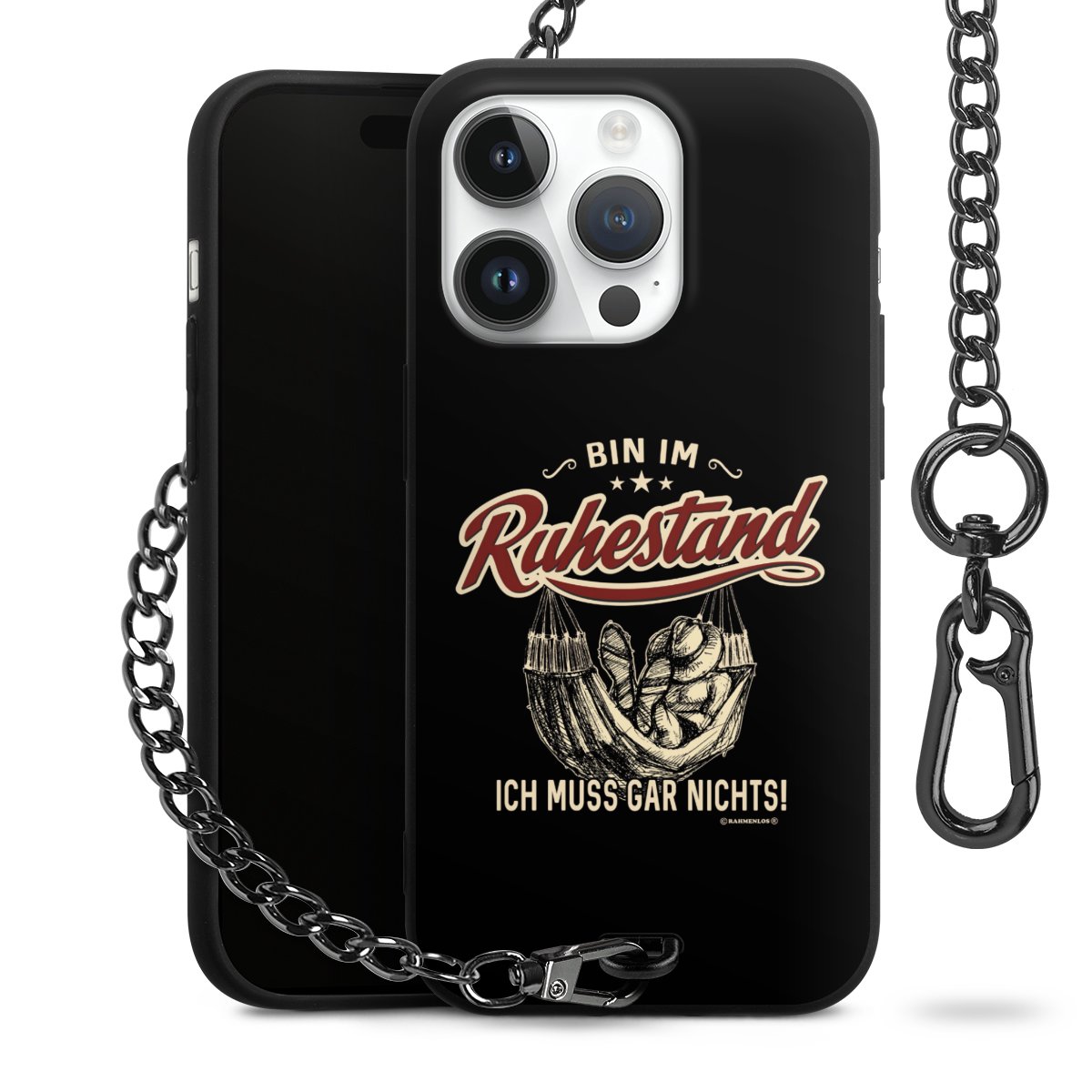Die mattschwarze Silikon-Handyhülle besteht aus robustem TPU (thermoplastisches Polyurethan). Sie ist flexibel und schützt Dein Smartphone vor Stößen und Kratzern. Die Kette sowie der Karabinerhaken sind aus Metall in Gunmetal-Optik gefertigt. Für dieses Produkt kommen ausschließlich TÜV-geprüfte Materialien zum Einsatz.