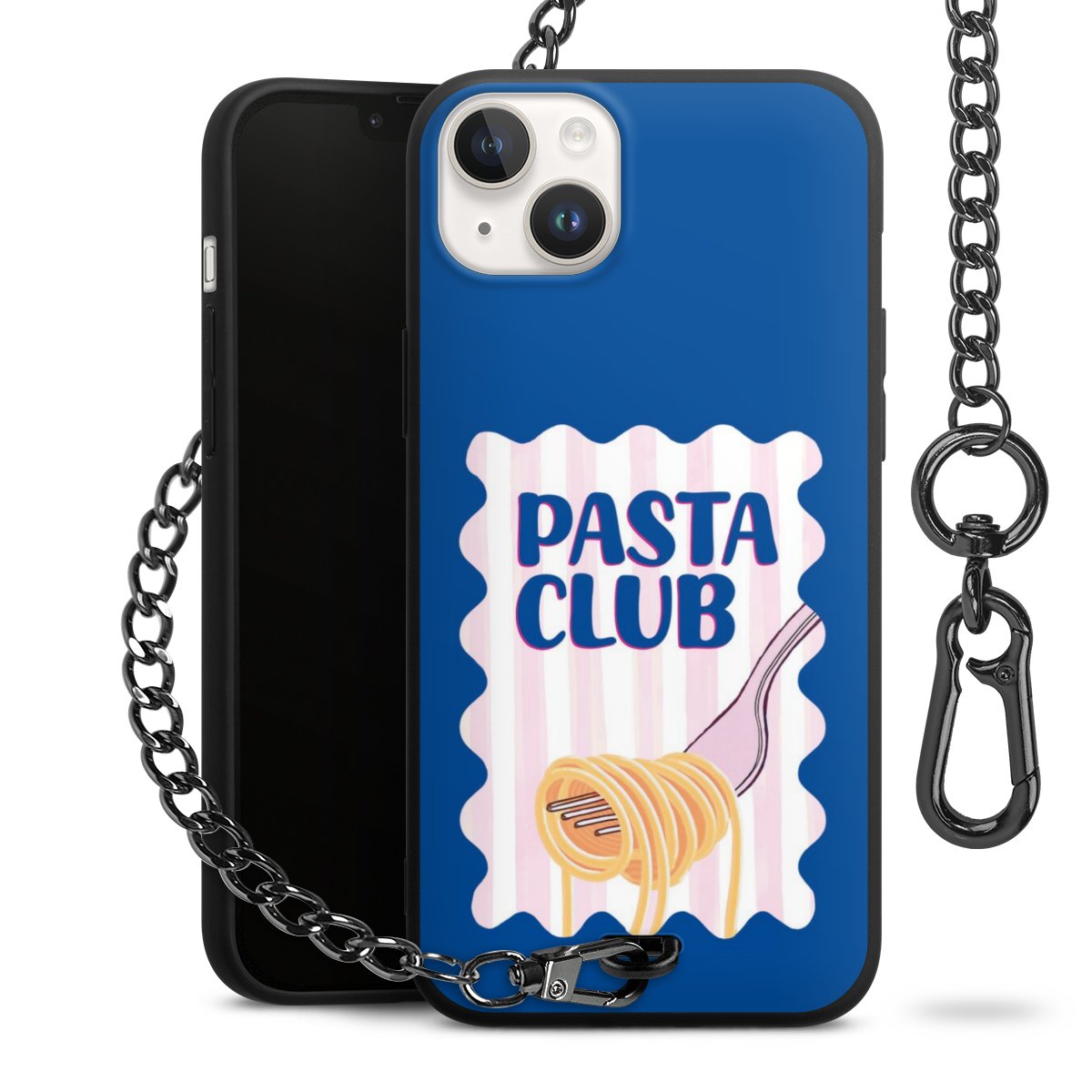 Die Handyhülle verfügt über eine mittig am unteren Rand platzierte Öse, an der die Metallkette stabil befestigt ist. Bestelle die Hülle einfach für Dein Smartphone-Modell, dann passt sie wie angegossen und Du brauchst sie bloß einmal anzudrücken. Handy in die Tasche, Karabiner an den Hosenbund – schon kann die Party starten.