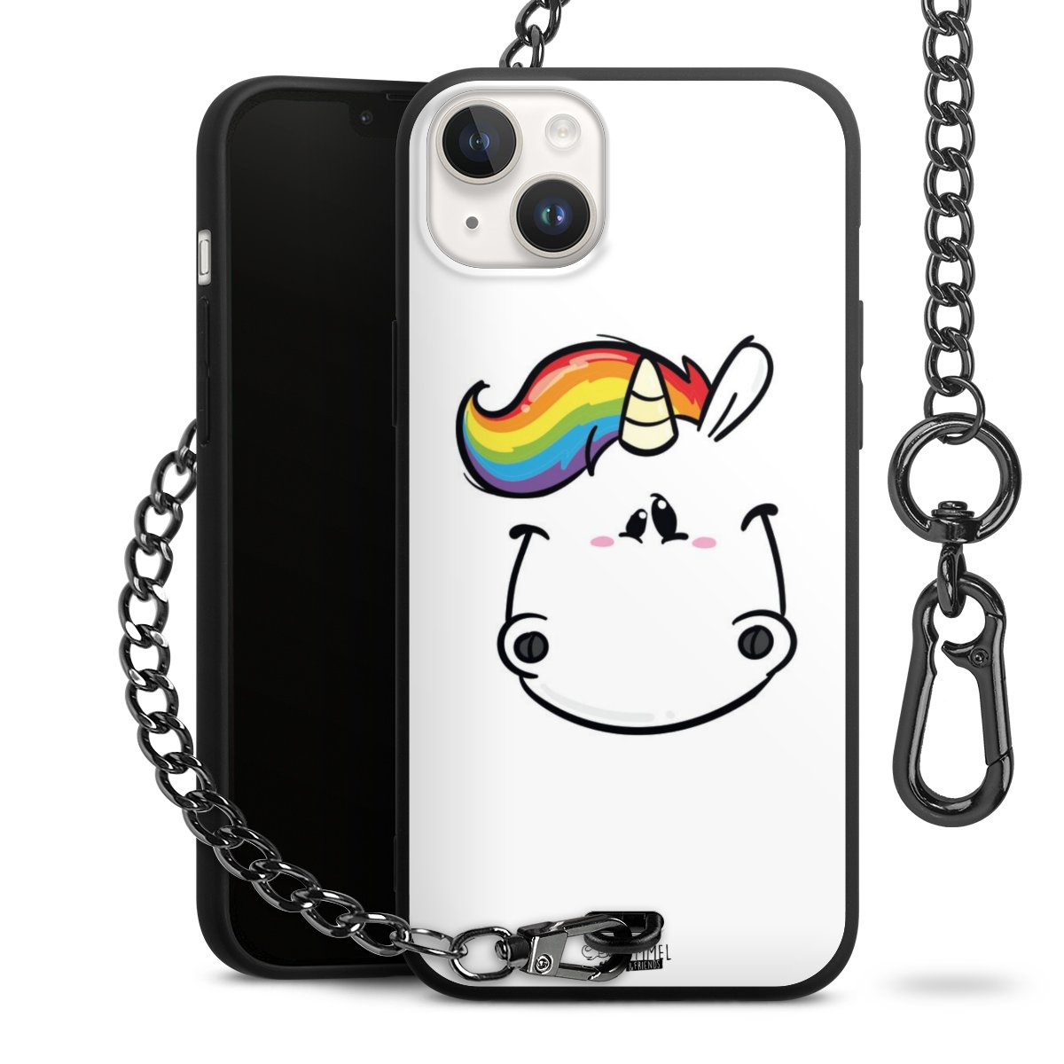 Die Handyhülle verfügt über eine mittig am unteren Rand platzierte Öse, an der die Metallkette stabil befestigt ist. Bestelle die Hülle einfach für Dein Smartphone-Modell, dann passt sie wie angegossen und Du brauchst sie bloß einmal anzudrücken. Handy in die Tasche, Karabiner an den Hosenbund – schon kann die Party starten.