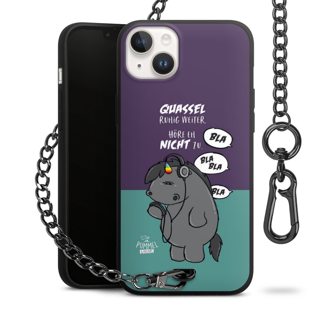 Die mattschwarze Silikon-Handyhülle besteht aus robustem TPU (thermoplastisches Polyurethan). Sie ist flexibel und schützt Dein Smartphone vor Stößen und Kratzern. Die Kette sowie der Karabinerhaken sind aus Metall in Gunmetal-Optik gefertigt. Für dieses Produkt kommen ausschließlich TÜV-geprüfte Materialien zum Einsatz.