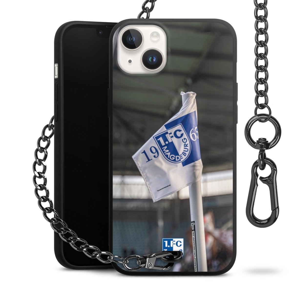 Die Handyhülle verfügt über eine mittig am unteren Rand platzierte Öse, an der die Metallkette stabil befestigt ist. Bestelle die Hülle einfach für Dein Smartphone-Modell, dann passt sie wie angegossen und Du brauchst sie bloß einmal anzudrücken. Handy in die Tasche, Karabiner an den Hosenbund – schon kann die Party starten.