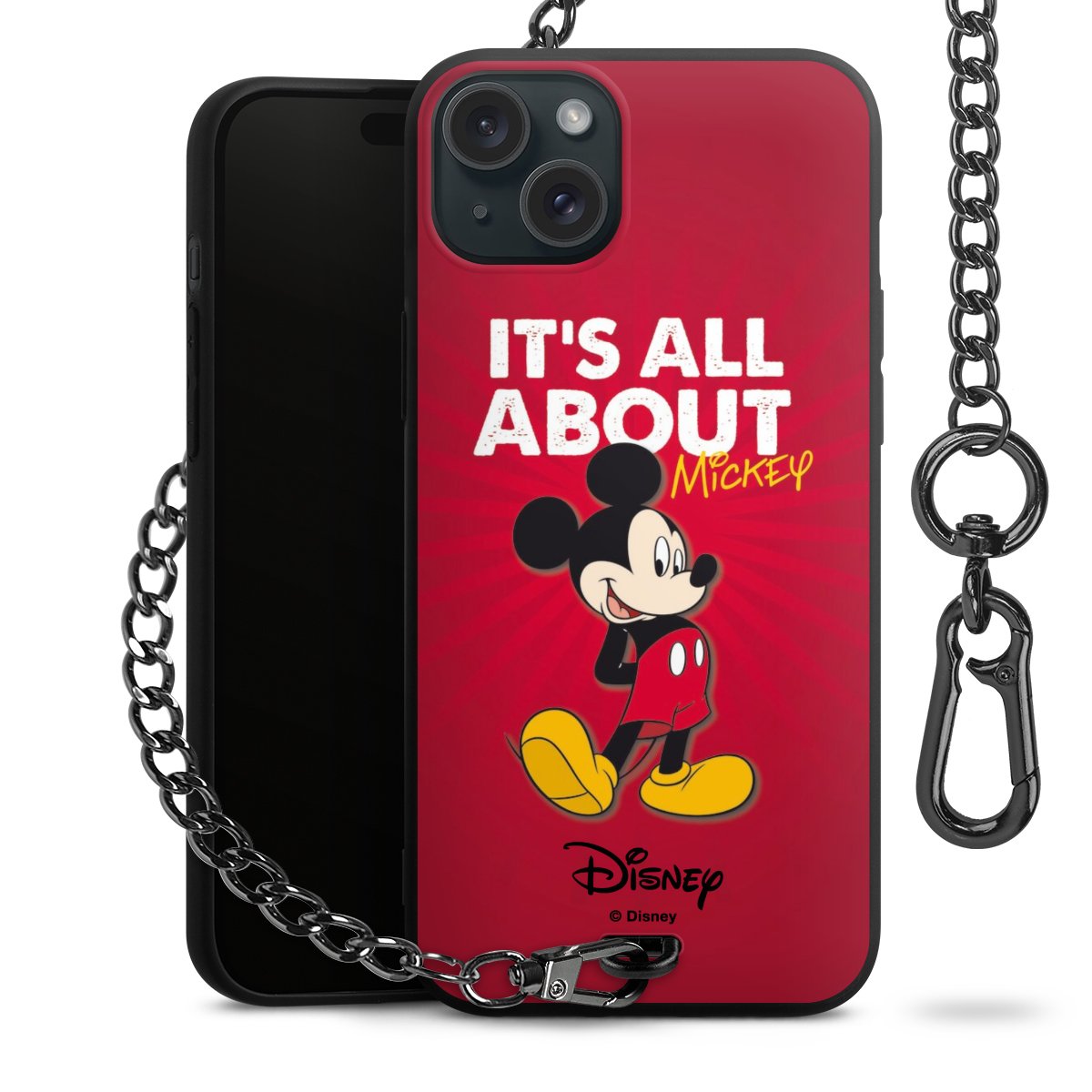 Die Handyhülle verfügt über eine mittig am unteren Rand platzierte Öse, an der die Metallkette stabil befestigt ist. Bestelle die Hülle einfach für Dein Smartphone-Modell, dann passt sie wie angegossen und Du brauchst sie bloß einmal anzudrücken. Handy in die Tasche, Karabiner an den Hosenbund – schon kann die Party starten.