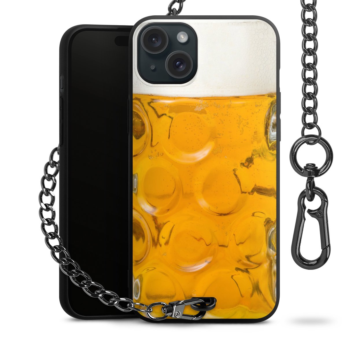 Die Handyhülle verfügt über eine mittig am unteren Rand platzierte Öse, an der die Metallkette stabil befestigt ist. Bestelle die Hülle einfach für Dein Smartphone-Modell, dann passt sie wie angegossen und Du brauchst sie bloß einmal anzudrücken. Handy in die Tasche, Karabiner an den Hosenbund – schon kann die Party starten.